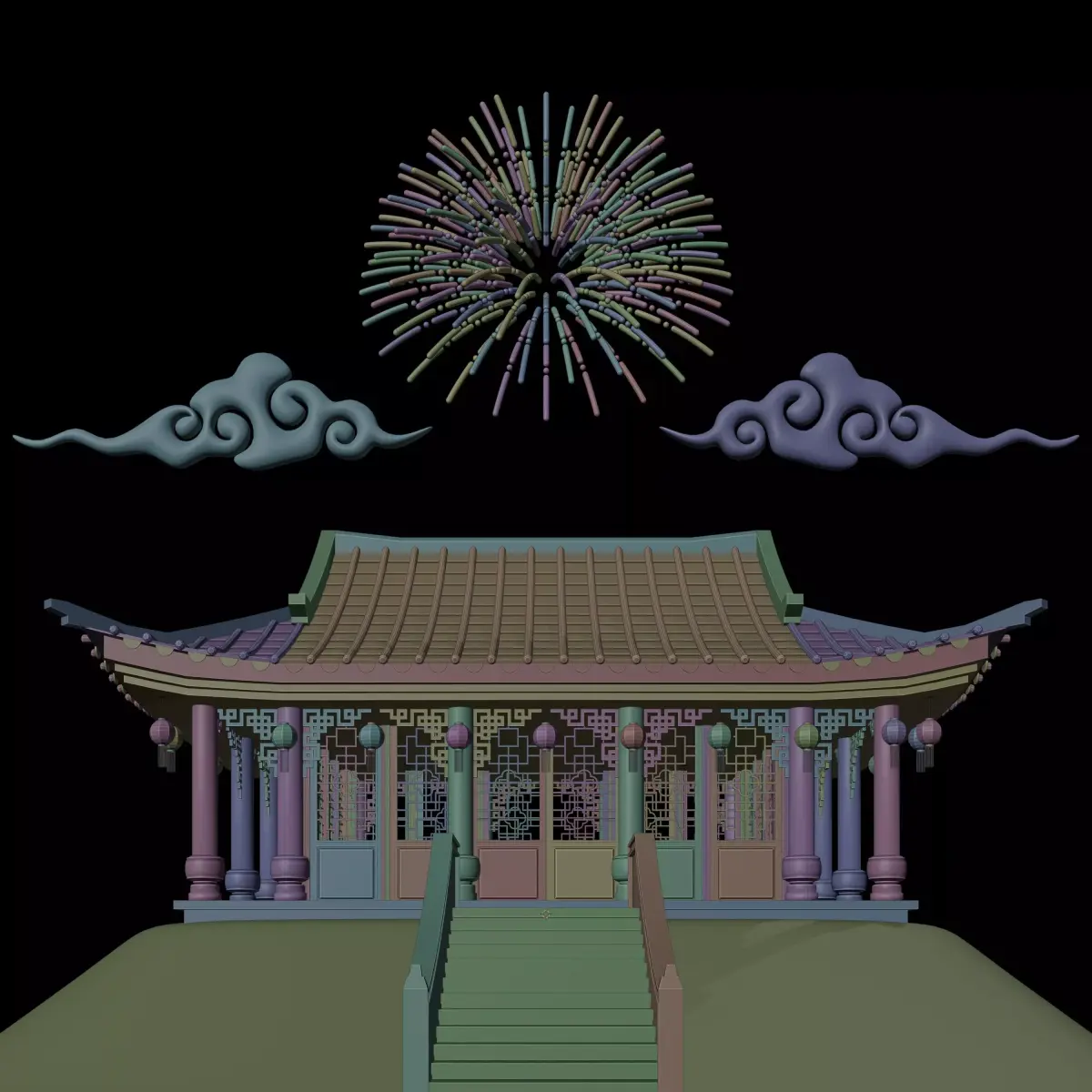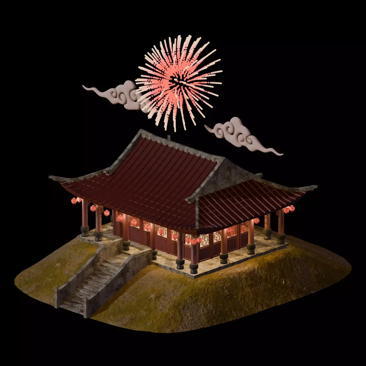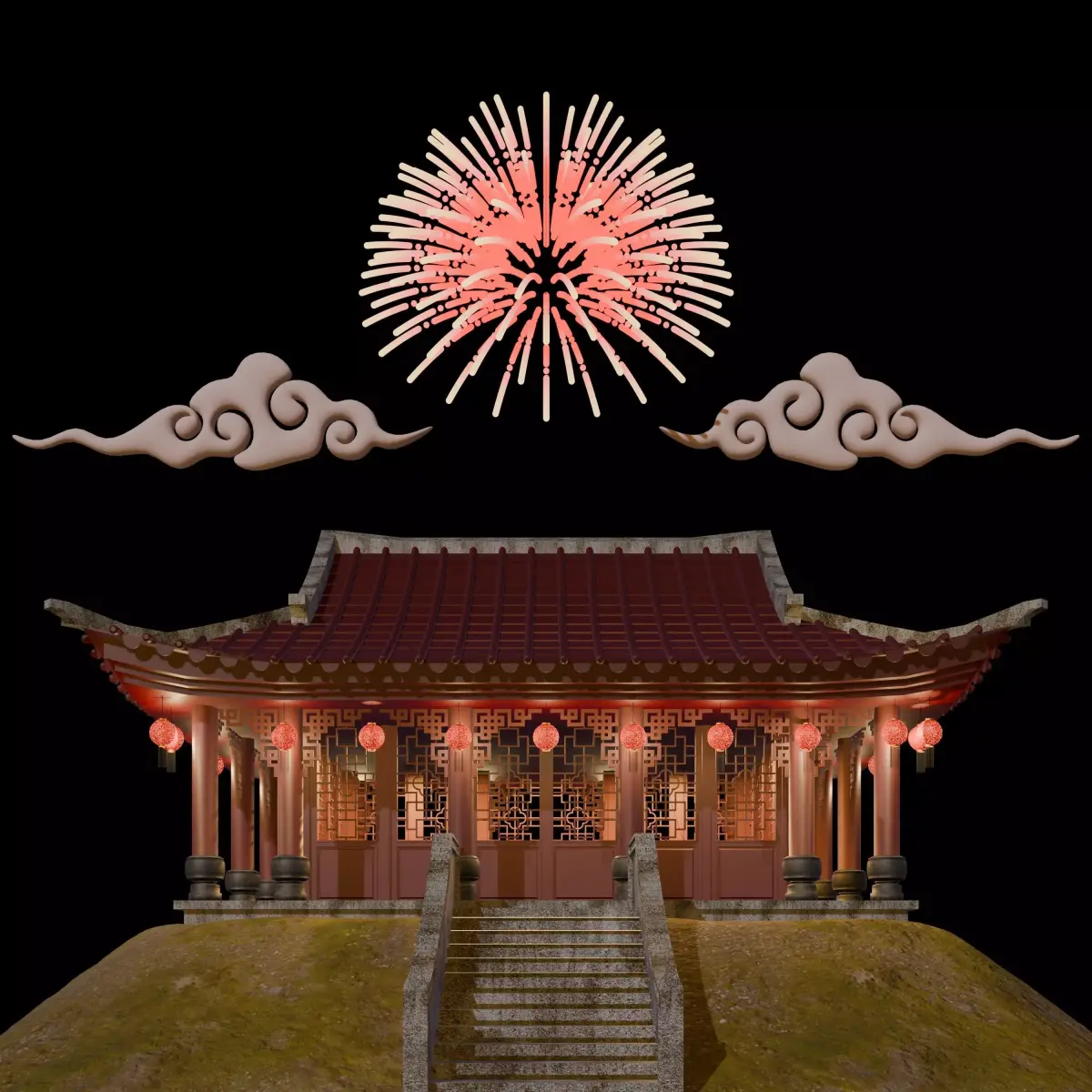Traditional Chinese House building, with clouds, and fireworks. Showing a Chinese New Year vibes. Originally made in Blender, also available in .OBJ and .FBX files