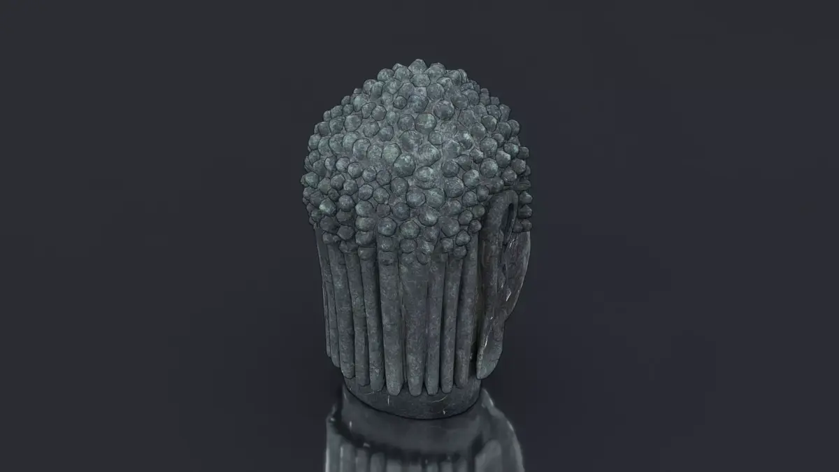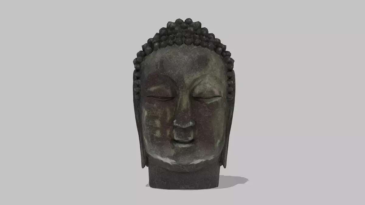 This evocative 3D low-poly model captures a traditional Chinese-style Buddha head sculpture featuring a textured ushnisha crowned with clustered snail-shell curls, elongated earlobes, and a profoundly peaceful expression with closed eyes and a faint, knowing smile. Rendered in a weathered, patina-like dark green hue suggestive of aged bronze or stone, it stands alone on a neutral gray background with a subtle shadow, embodying themes of enlightenment, meditation, and cultural reverence in a simplified, digital form suitable for games, virtual exhibits, or artistic renders.