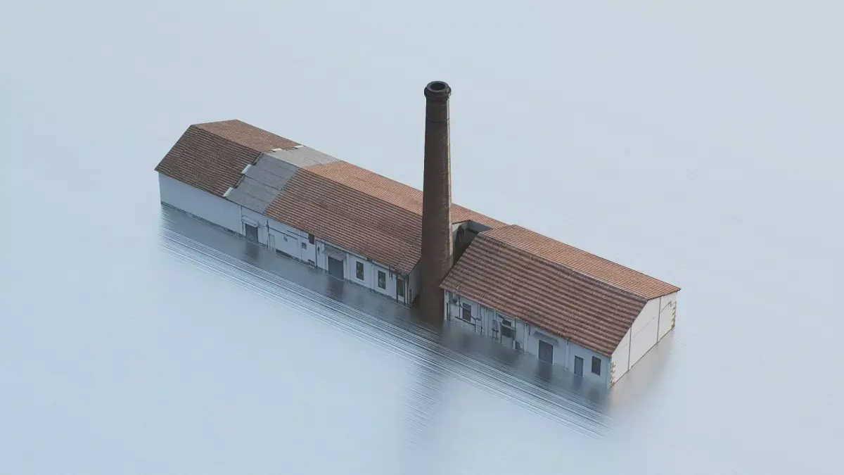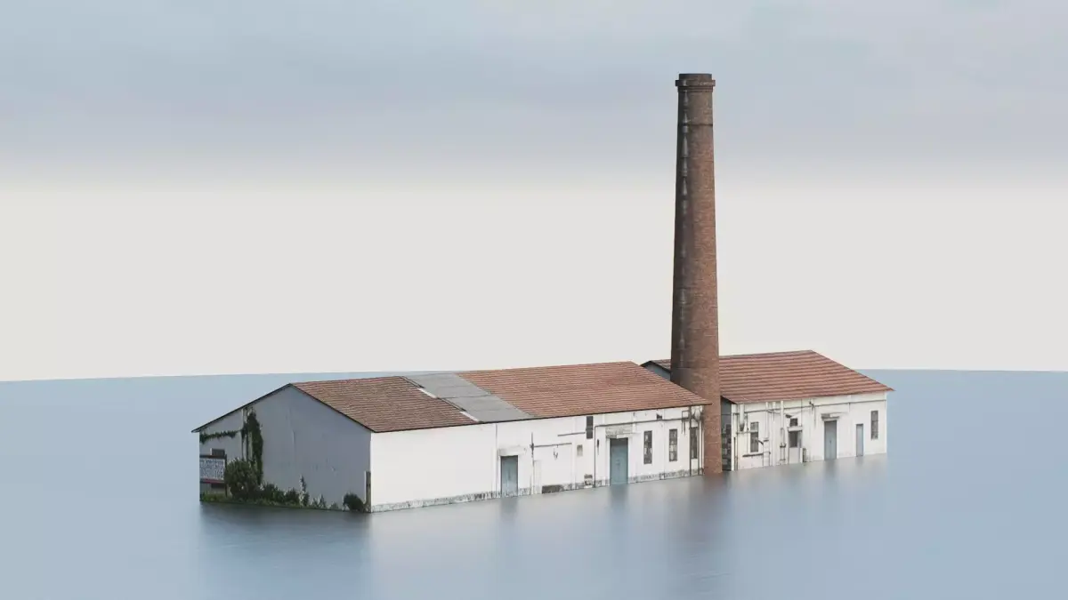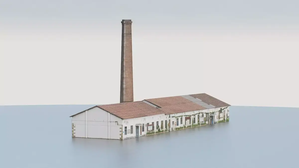 This 3D low-poly model depicts a typical Chinese township factory, characterized by its elongated single-story structure with a sloped tiled roof and a prominent brick chimney. The building exhibits signs of age and weathering, with patches of moss and peeling paint, reflecting years of industrial use in a rural or semi-urban setting. Designed for efficiency and functionality, the factory features multiple windows and doors along its length, suggesting areas for production, storage, and access. The model captures the essence of small-scale industrial architecture commonly found in China’s countryside during the mid-to-late 20th century, blending utilitarian design with modest architectural details.