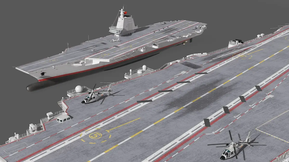 The Type 003 aircraft carrier, also known as Fujian (CV-18), is the third aircraft carrier of the People's Liberation Army Navy (PLAN) and represents a significant advancement in China's naval capabilities. It is notable for being the first Chinese carrier equipped with a flat deck and an electromagnetic aircraft launch system (EMALS), allowing for more efficient and versatile aircraft operations.The Harbin Z-9 is a medium utility helicopter developed in China, based on the French Aerospatiale AS365 Dauphin. It has been adapted for various roles, including transport, reconnaissance, and anti-submarine warfare, and is widely used by the People's Liberation Army (PLA) and other branches of the Chinese military.