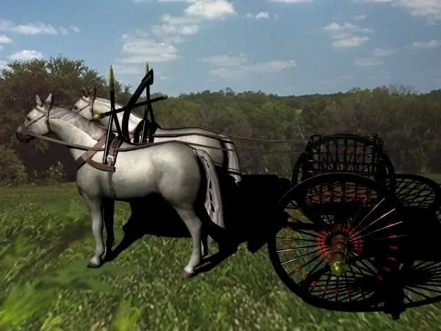 Chinese war chariot 770BCThe is a model of a Chinese war chariot from the Zhou Dynasty around 770BC. Earlier chariots had fewer spokes. The carriage body was around 0.914m long and 1.65m wide. It was drawn by two horses.Usually a chariot carried three armored warriors with different tasks: the charioteer was the driver, the archer was the primary assault specialist and the third man provided close combat defense.