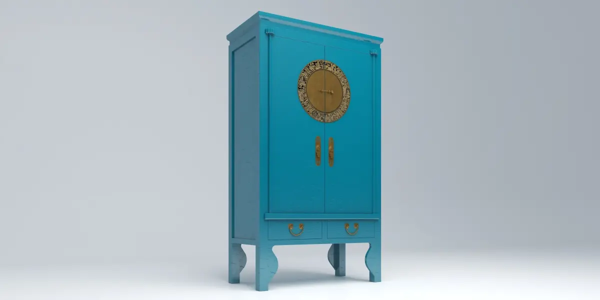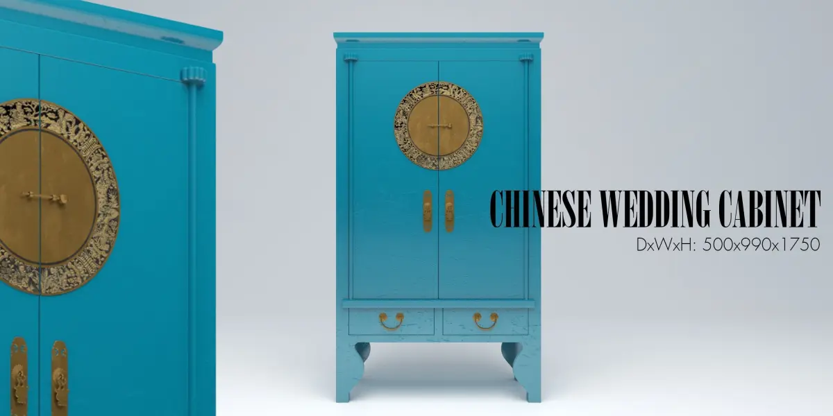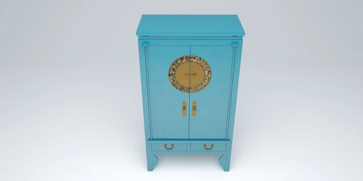 Antique Chinese wedding cabinet: Two doors over two drawers / brass hardware / blue lacquered surfaces