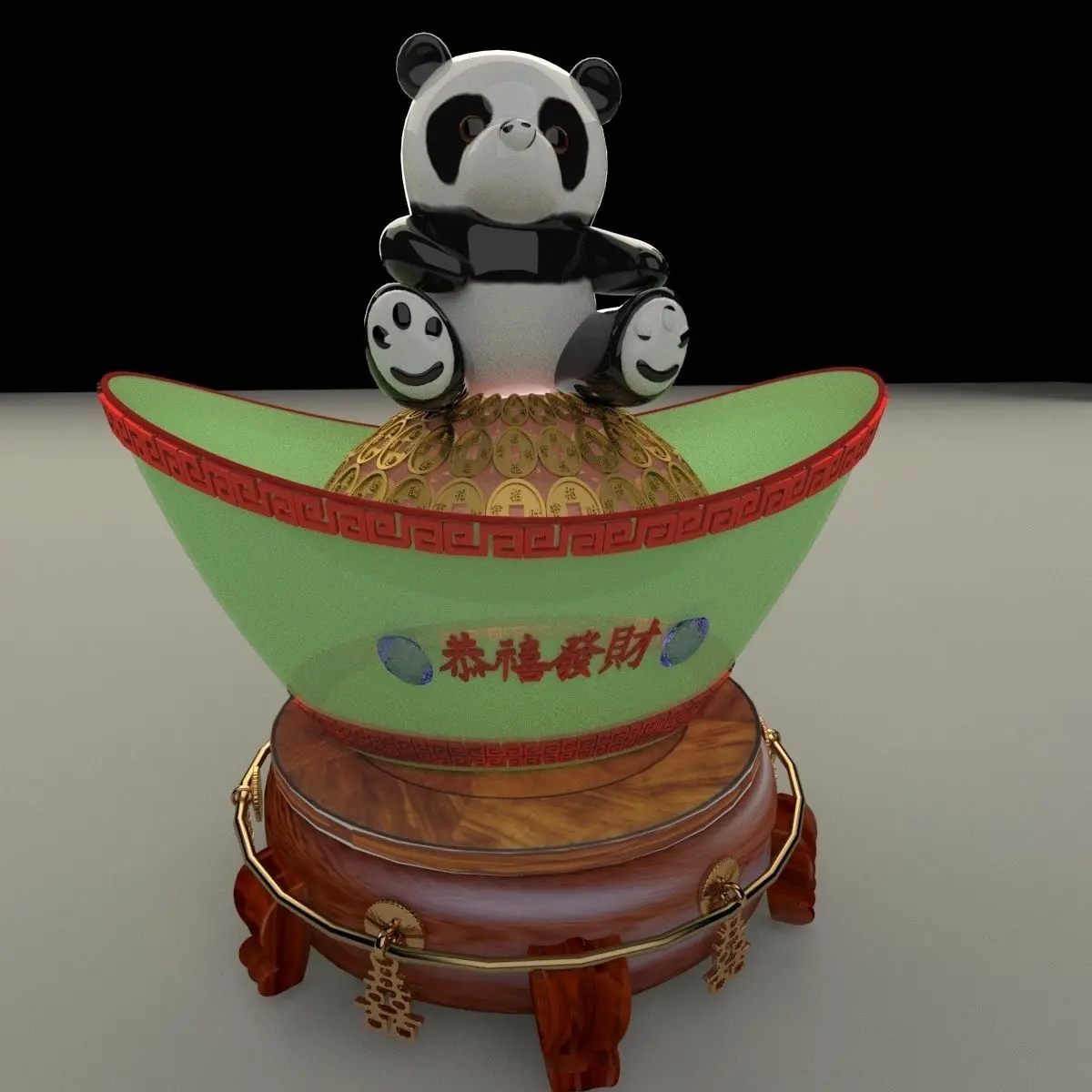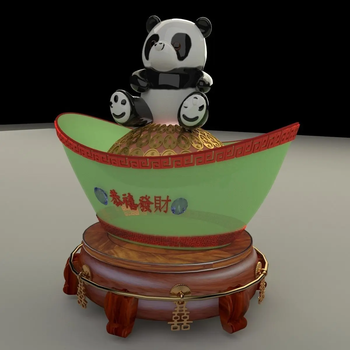 Chinese gold Ingot(Yuan Bao) with panda sculpture 3D models created in 3D Max.(.max,.obj,.stl) . All scene and texture map are included in Zip file. All scene are rendered by VRay.Available files: chinese_yuanbao_pandaA.rar