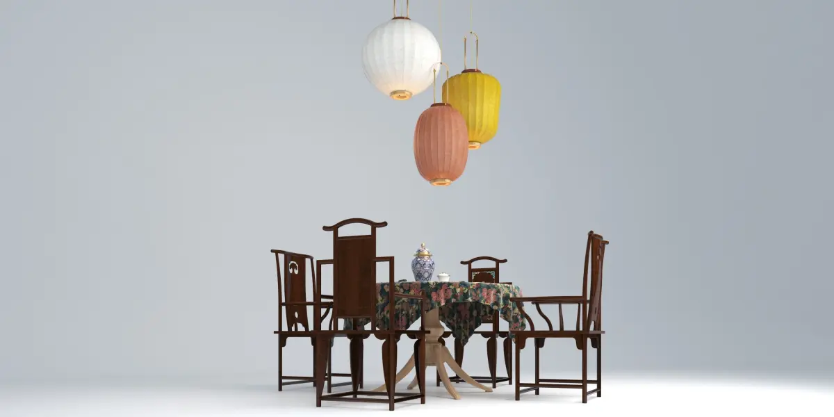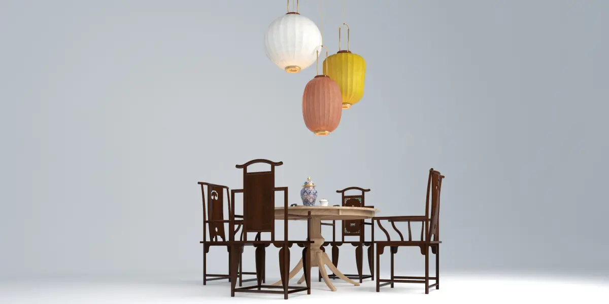 a skirted round dining table, Chinese Ming chairs, and the iconic Taiwan neo-raditional Lanterns.