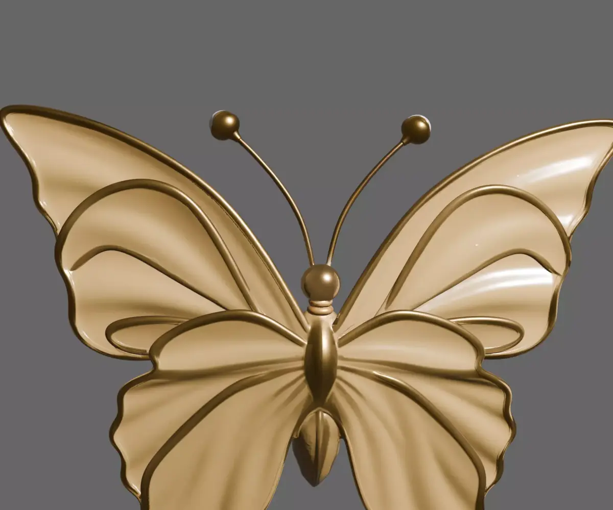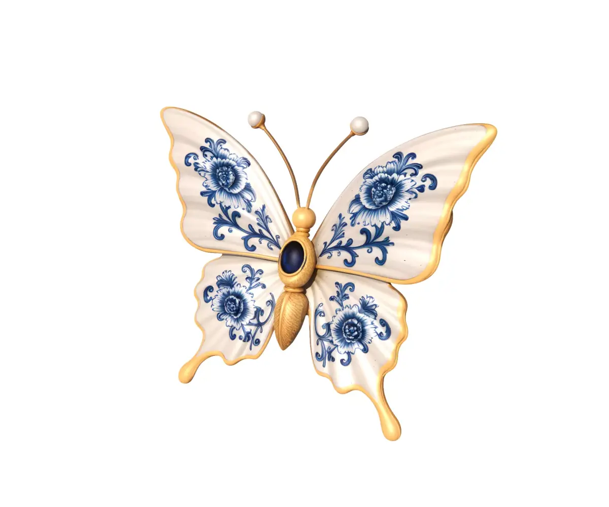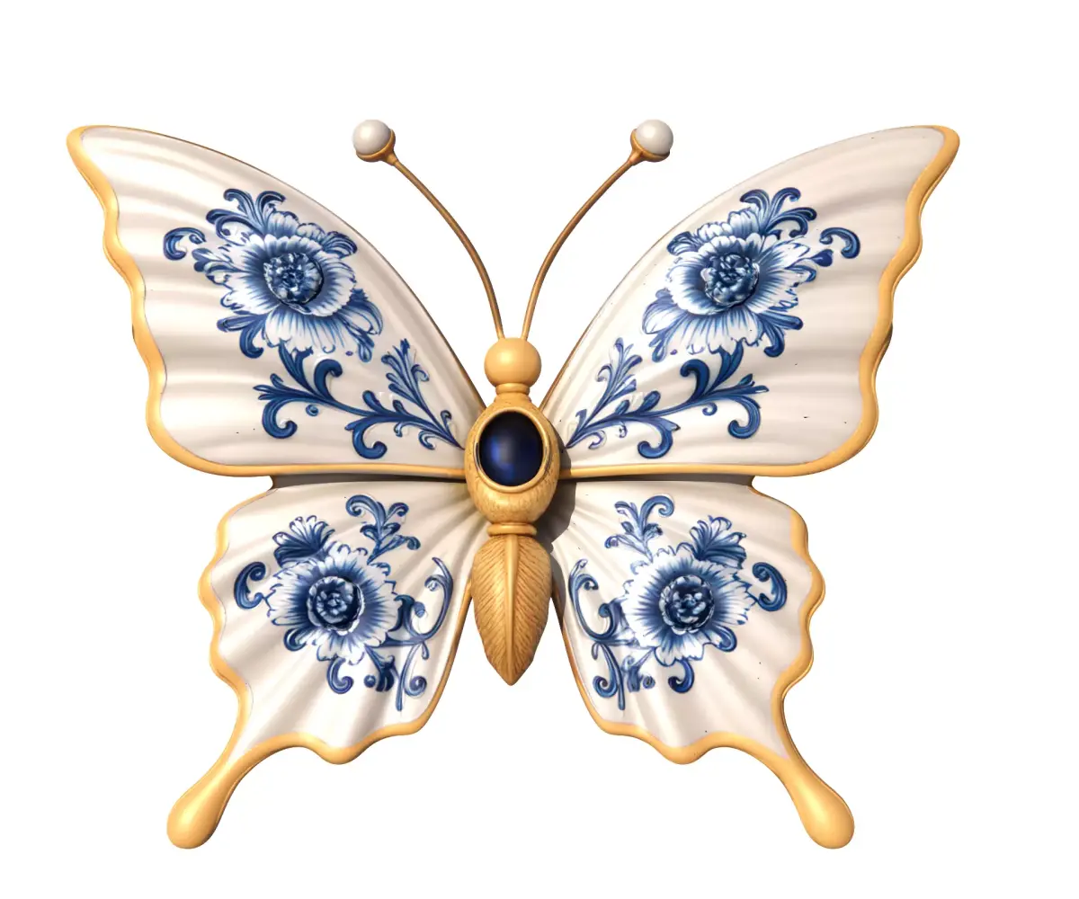 This is a Chinoiserie Floral Butterfly Statue that epitomizes elegant East-meets-West design. Crafted to mimic fine porcelain with a glossy finish, the butterfly features intricate hand-painted blue peony and scroll motifs on its scalloped wings, bordered by polished gilt gold trim. A rich blue gemstone centerpiece and delicate gold antennae enhance its luxurious appeal, making it a sophisticated decorative accent for traditional or contemporary interiors alike.