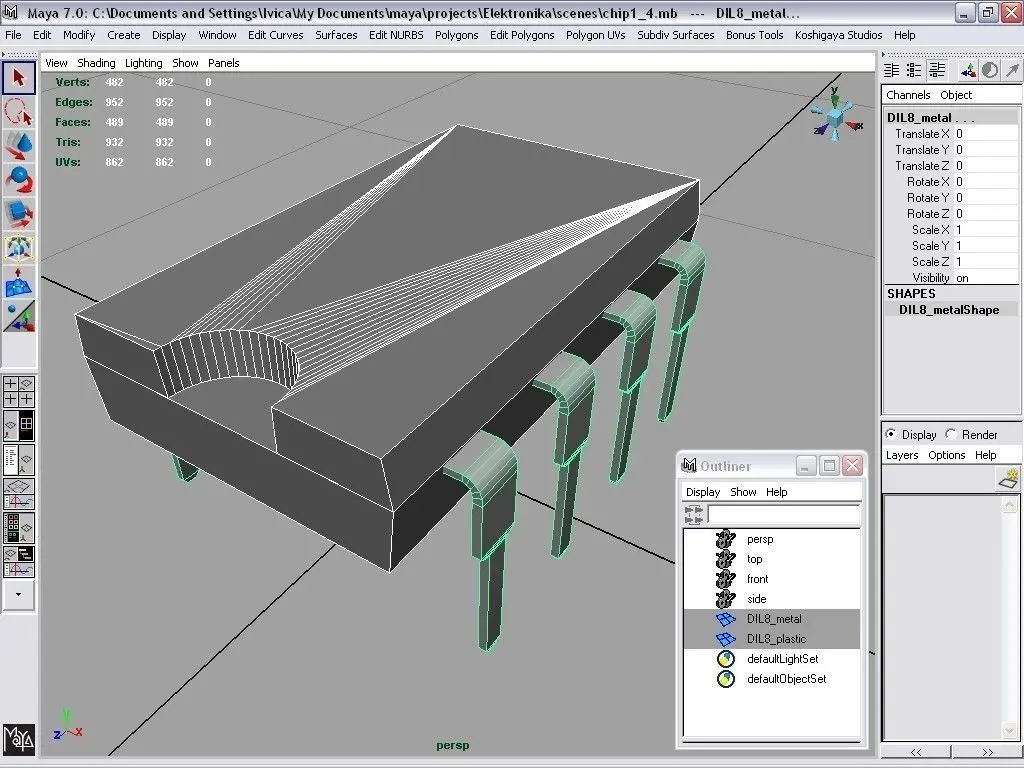 Low poly integrated circuit model, chip in DIL8 package.Built with Maya 7, clean topology, no N-gons.UV mapped, unwrapping done with no overlapping, rendered with V-ray (ver. 1.5) renderer in 3ds Max, render scene included. Basic blinn materials with Layered Textures node in Maya file.Maya 7 (.ma, .mb), OBJ (.obj with .mtl), 3ds Max 2009 (.max) and Autodesk FBX (.fbx) format included.FBX and OBJ are directly exported from Maya.Polygons: 489 quads/ 932 trianglesVertices: 482Textures included in chip_DIL8_textures.zip file:-1024×1024 pixels .jpg opacity (transparent) map for label, 2 versions-1024×1024 pixels .jpg diffuse (color) map, 2 versions - not used-1024×1024 pixels .psd working map - if you need to change label or make another texture (see thumbs)