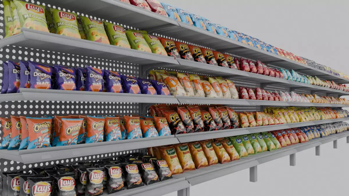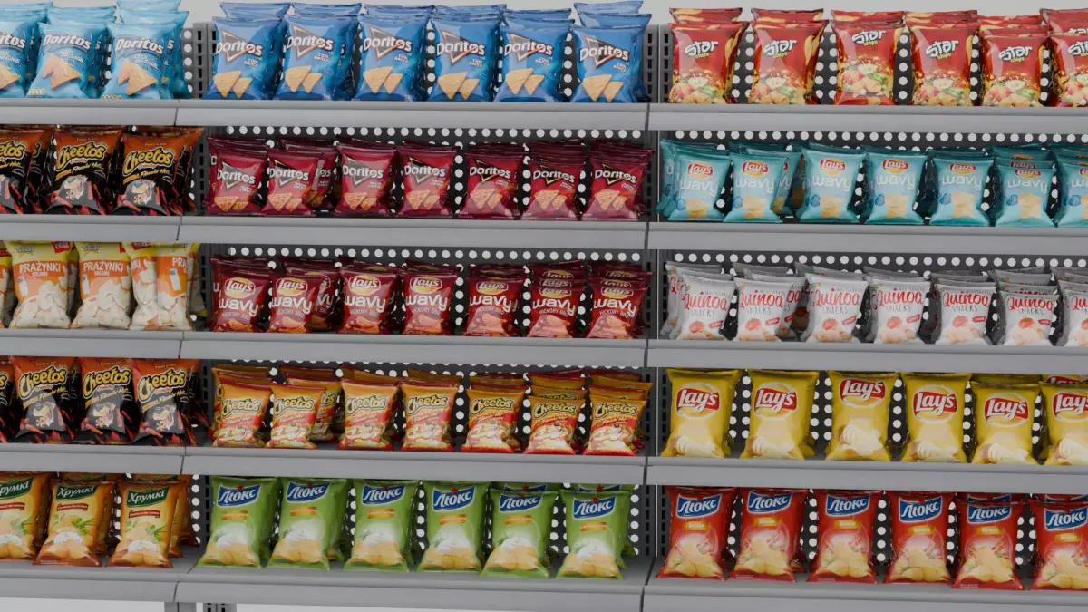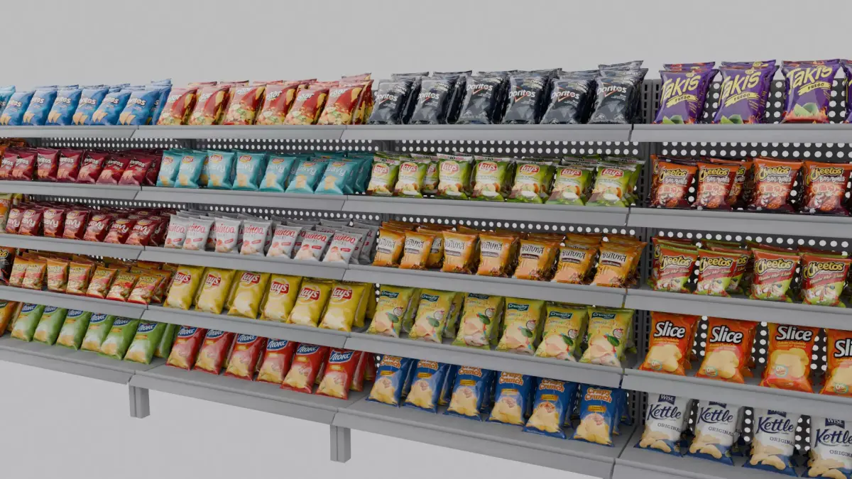 This 3D model created in Blender 4.5, featuring 34 unique chip models arranged on 7 shelves. Works fine in both cycles & eevee render engines.All textures are included, making it ready for rendering in your projects. Perfect for retail scenes, product showcases, or game environments.