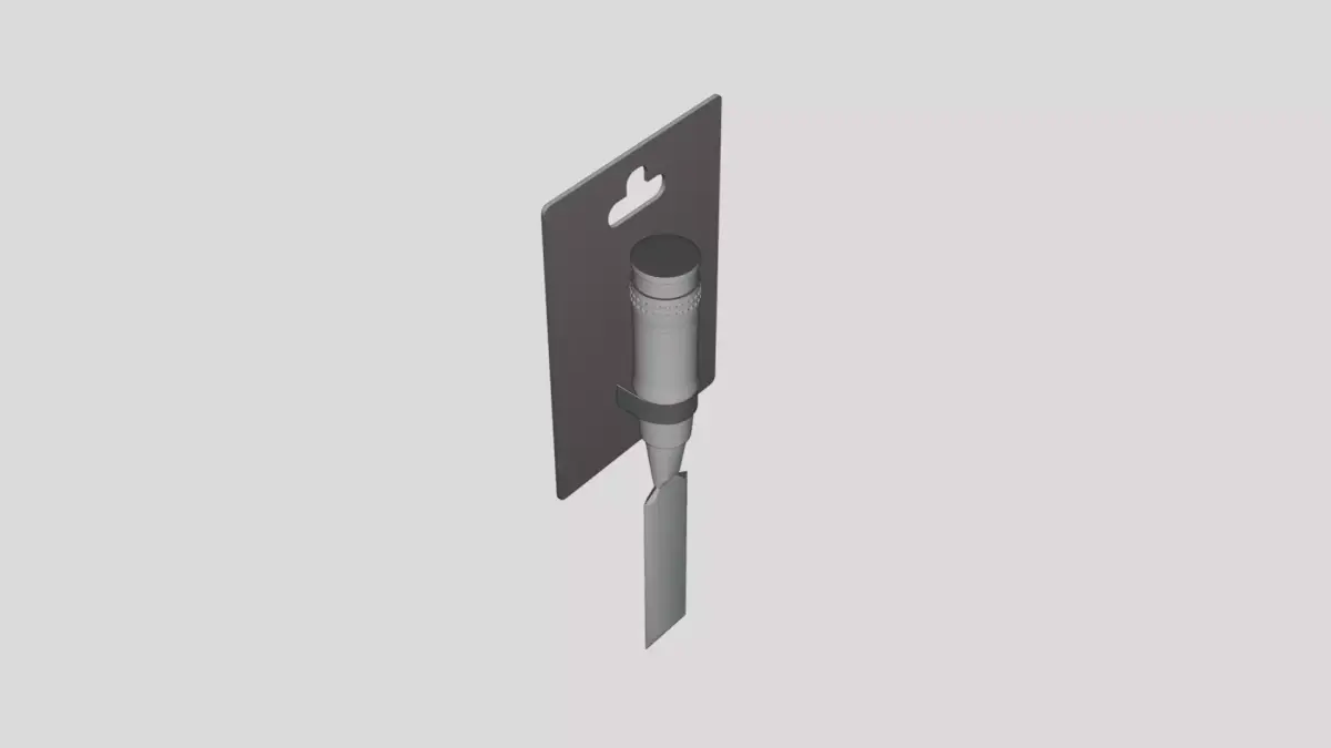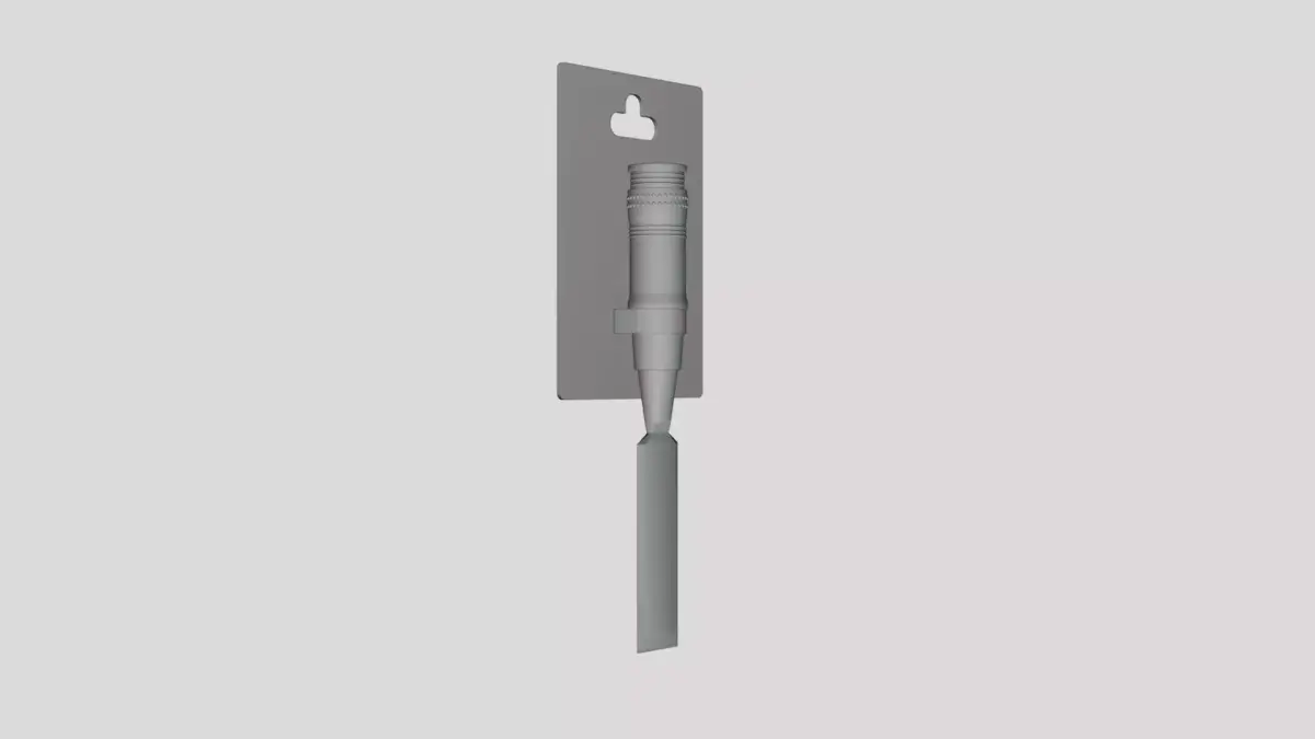 chisel tool package including the chisel blade, handle grip, packaging back card, and plastic blister seal. Ideal for hardware store visualization, tool product mockups, and retail display scenes.