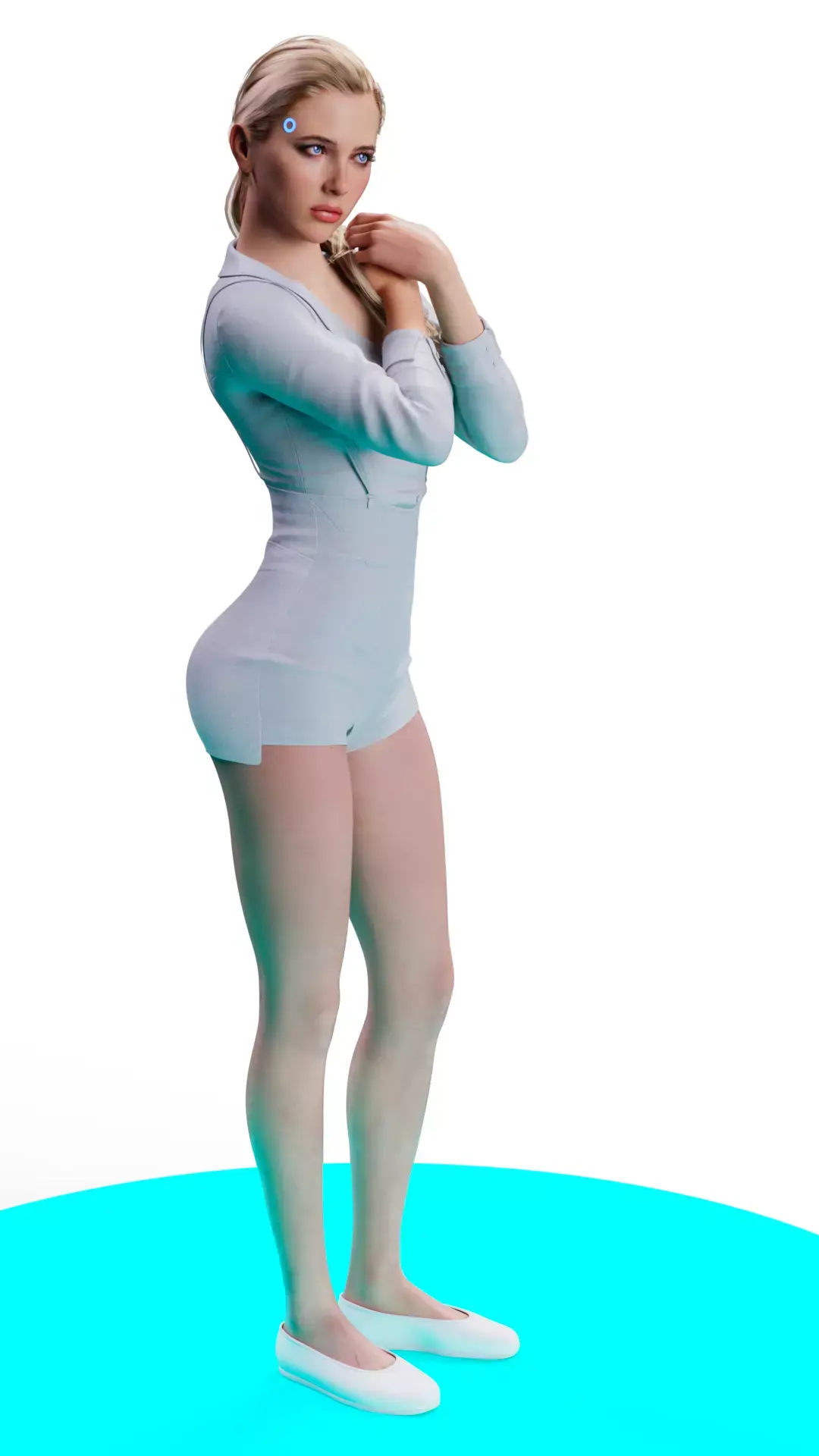 A hyper-realistic 3D render of Chloe, the iconic android from Detroit: Become Human. The model presents her in a casual outfit and a contemplative pose, highlighting the photorealism of her skin, neatly styled blonde hair, and the details of her simple yet elegant attire. The lighting emphasizes her delicate features and the clothing texture.