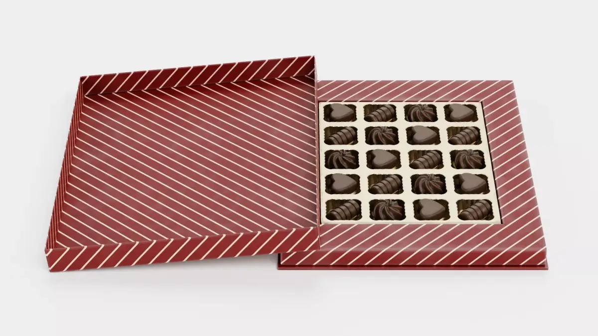 - Dark red chocolate box with subtle stripe detailing, matching lid and gold interior tray