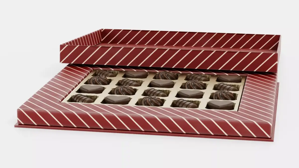 A sleek dark red chocolate box with subtle stripe detailing filled with 20 assorted pralines arranged in a realistic gold interior tray. The box features a clean, unbranded lid that fits naturally, making it easy to customize for packaging mockups or product visualizations. Three unique praline types are included, each carefully modeled for variety and a premium look. The lid can be placed on or next to the box, allowing flexible scene composition.