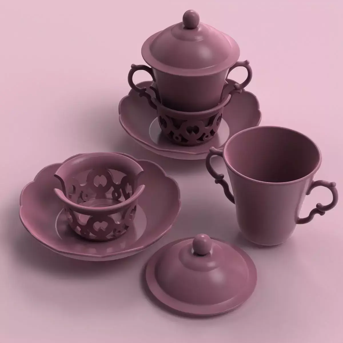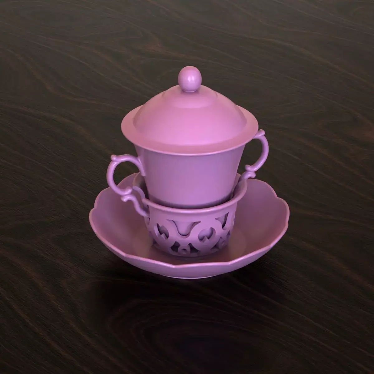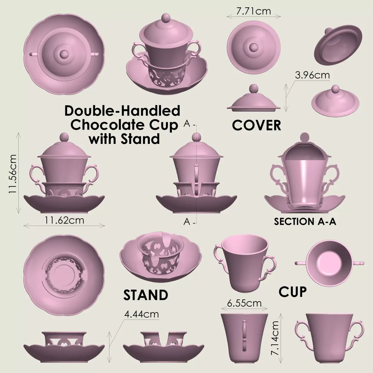 3D printable Two-Handled Chocolate Cup with Cover and Stand. The stand consists of a saucer with a holder for inserting the cup. The cup can hold 120 ml of liquid. Separate print files are provided for the cup, cover and stand. Molds of the cup and the cover are also provided in the form of stl.