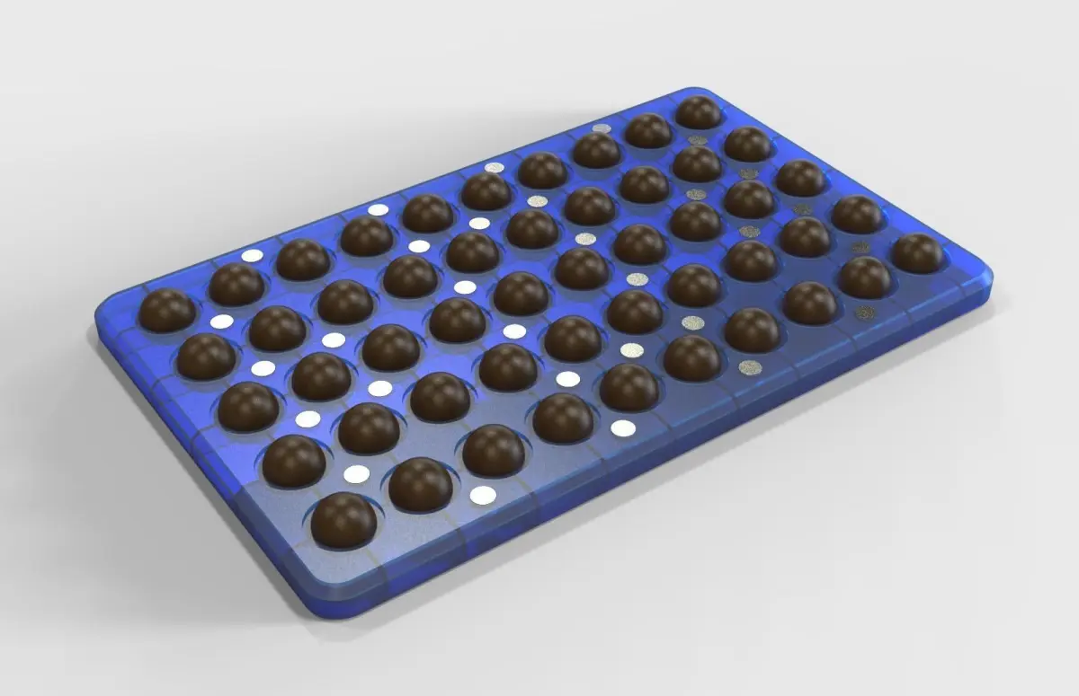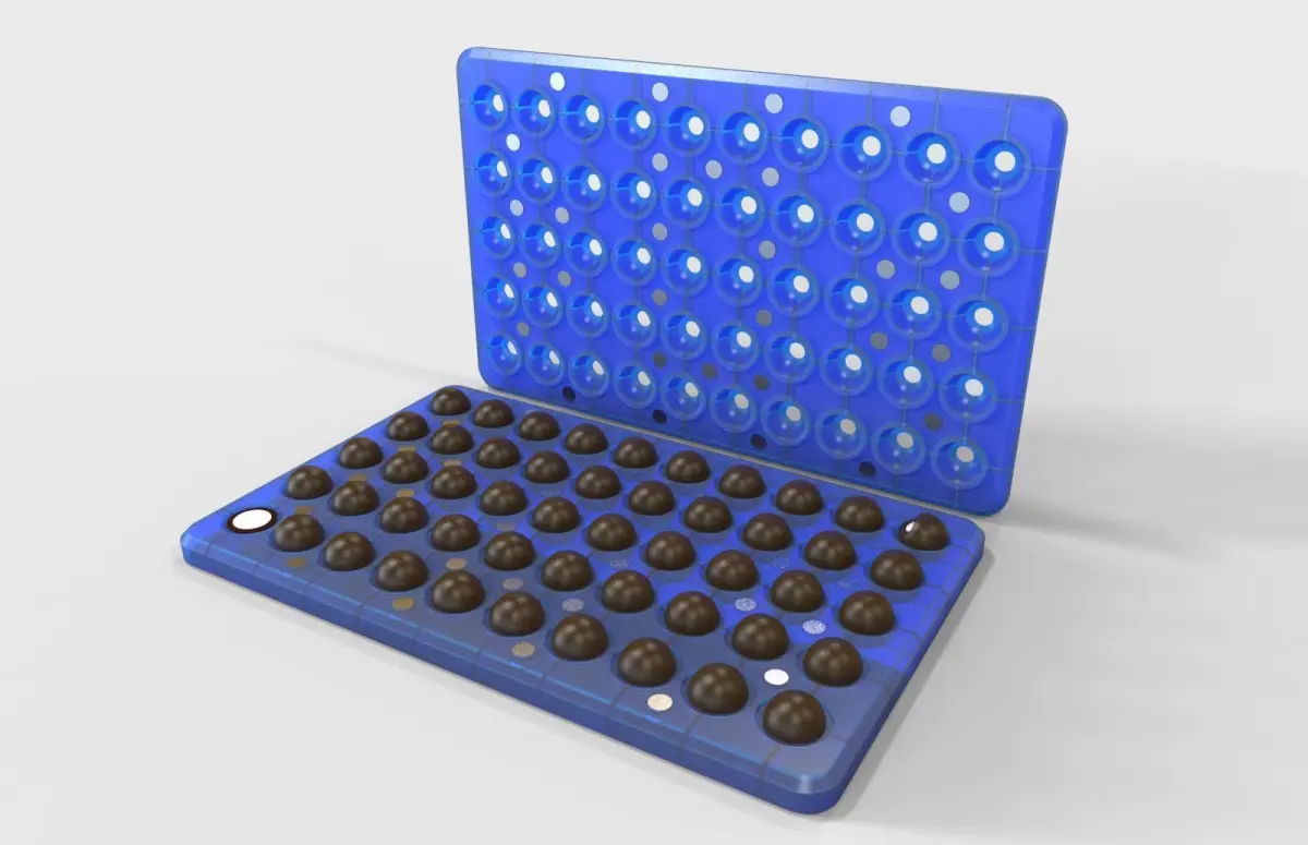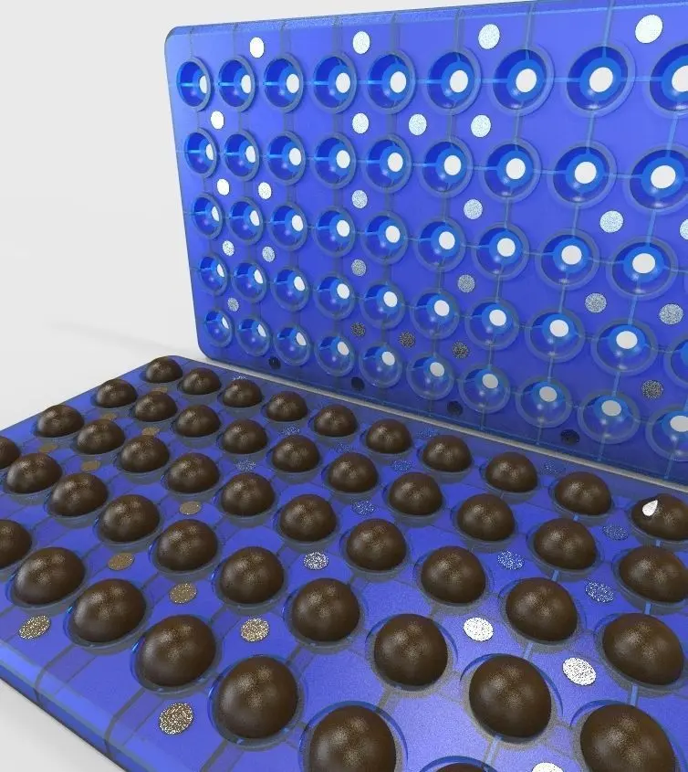 This is a chocolate mold. You can make ball chocolate with this mold. It has two parts. Uppart part and lower part. Upper part contain half part of the ball and lower part contain other part of the ball. Both parts are attached by magnets. Magnets diameter 10mm and thickness 1mm. Chocolate ball diameter 24mm. Magnet link below,https://www.amazon.in/GMT-Ceramic-Ferrite-Refrigerator-Projects/dp/B0B86JYDHR/ref=sr_1_11?keywords=button+magnet&qid=1666696800&qu=eyJxc2MiOiI1LjI2IiwicXNhIjoiNC41NCIsInFzcCI6IjMuMTQifQ%3D%3D&sr=8-11