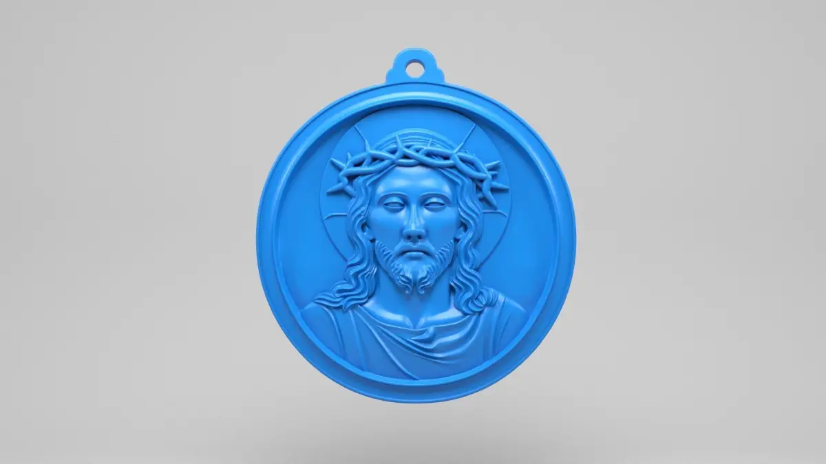 This 3D model represents a medallion featuring a classic depiction of Christ, designed with intricate details to emphasize reverence and artistry. The relief work is crafted to highlight fine details, making it suitable for personal or religious use.