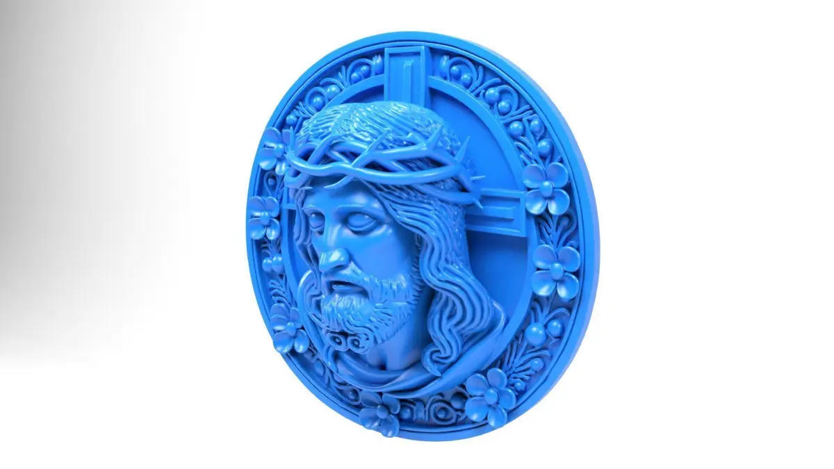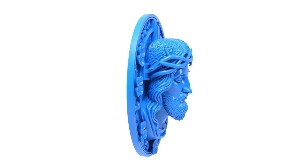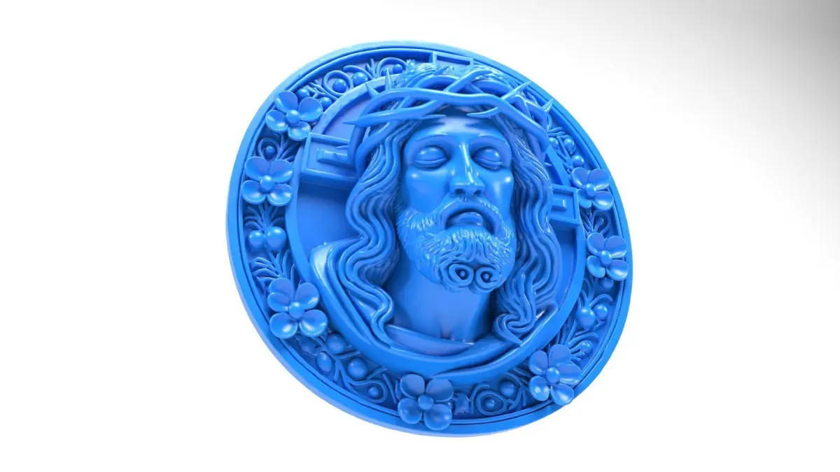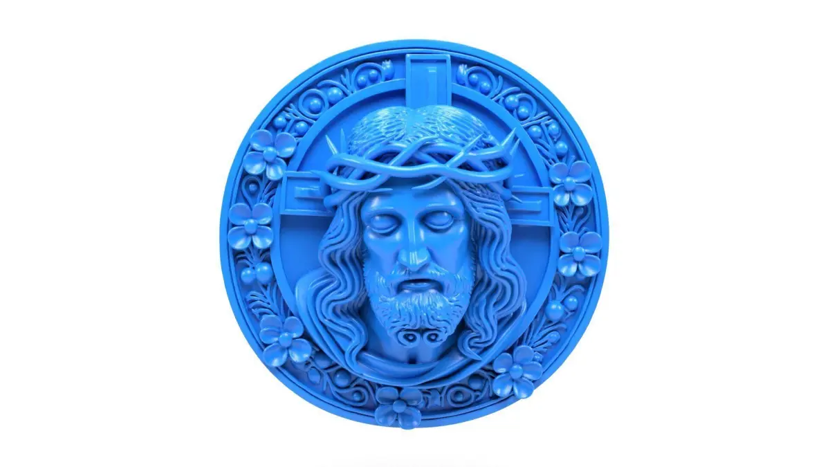 This piece embodies a classic representation of a religious icon, capturing detailed features and enigmatic expressions in a circular medallion format.
