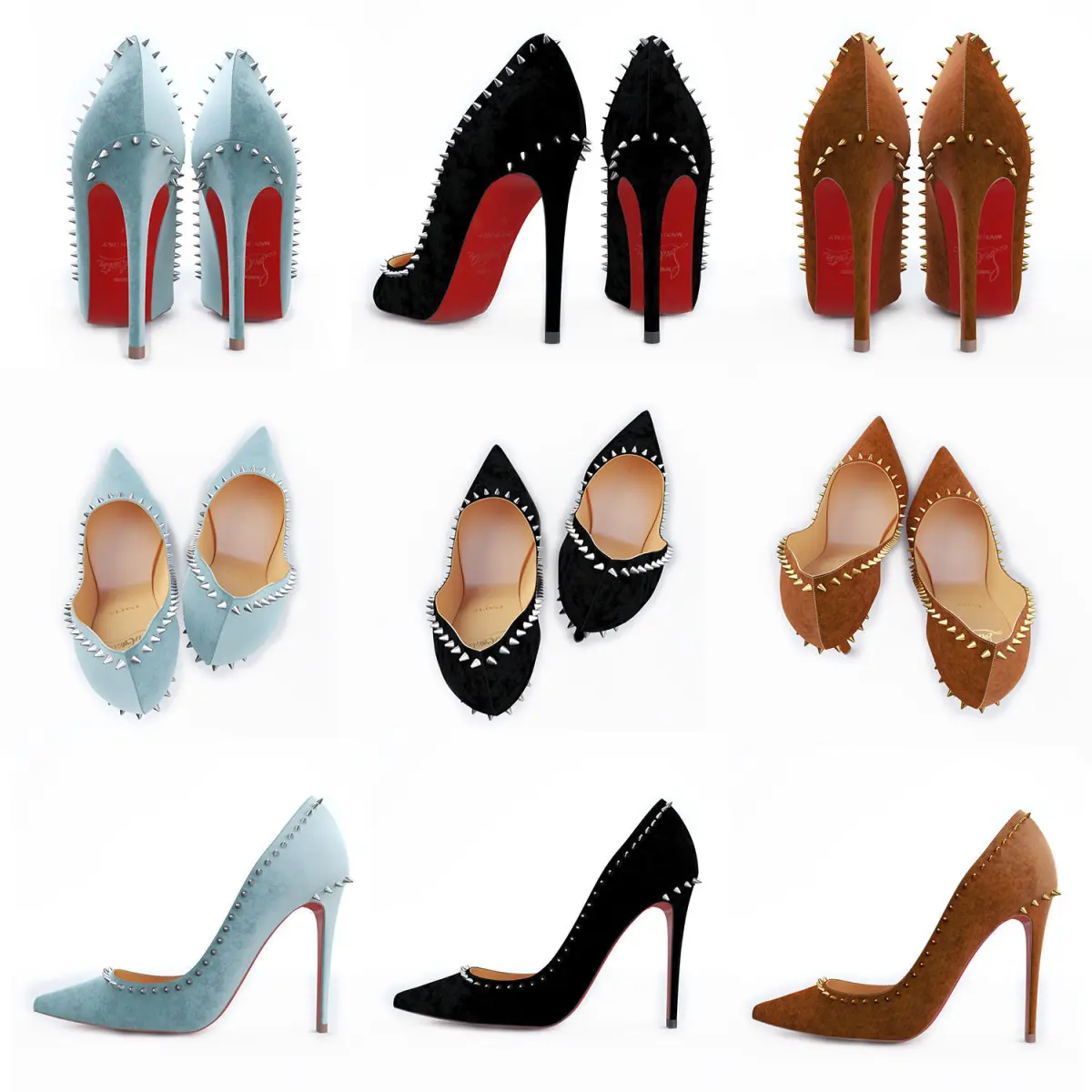 3 Pairs of Christian Louboutin Anjalina 100mm high heels in black, pale blue and brown suede.