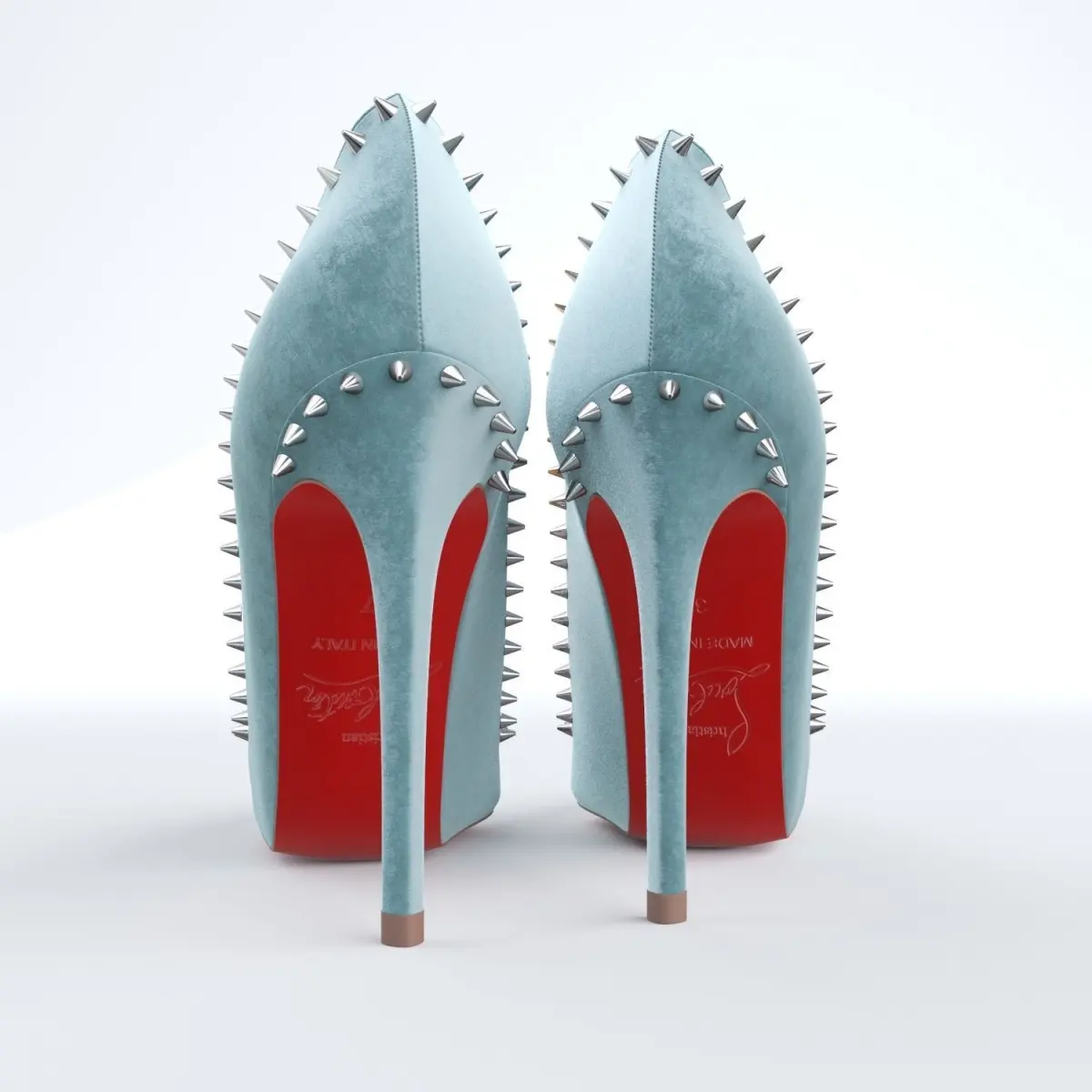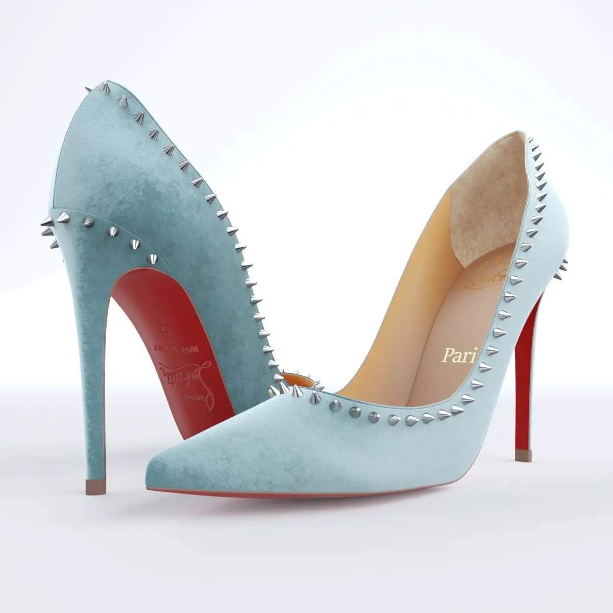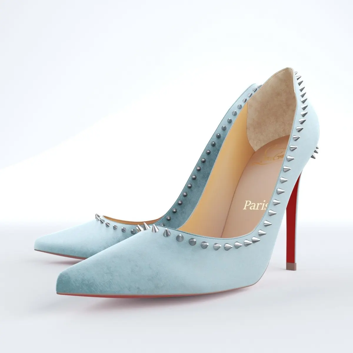 Christian Louboutin's refined Anjalina flirts the line between soft and bold. Black gunmetal spikes form an edgy halo around the daringly deep-cut vamp and pointy-toe pump that perfectly mixes punk rock and posh. The pair is crafted entirely of tonal Veau Velours and mounted on a 100mm heel to showcase the foot in all its beauty.