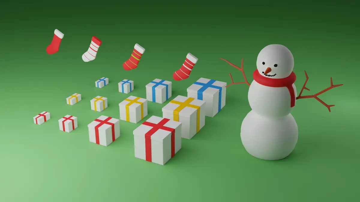 The collection includes a snowman, 4 types of Christmas socks and 12 types of gift boxes of different sizes and ribbon colors: red, gold, blue