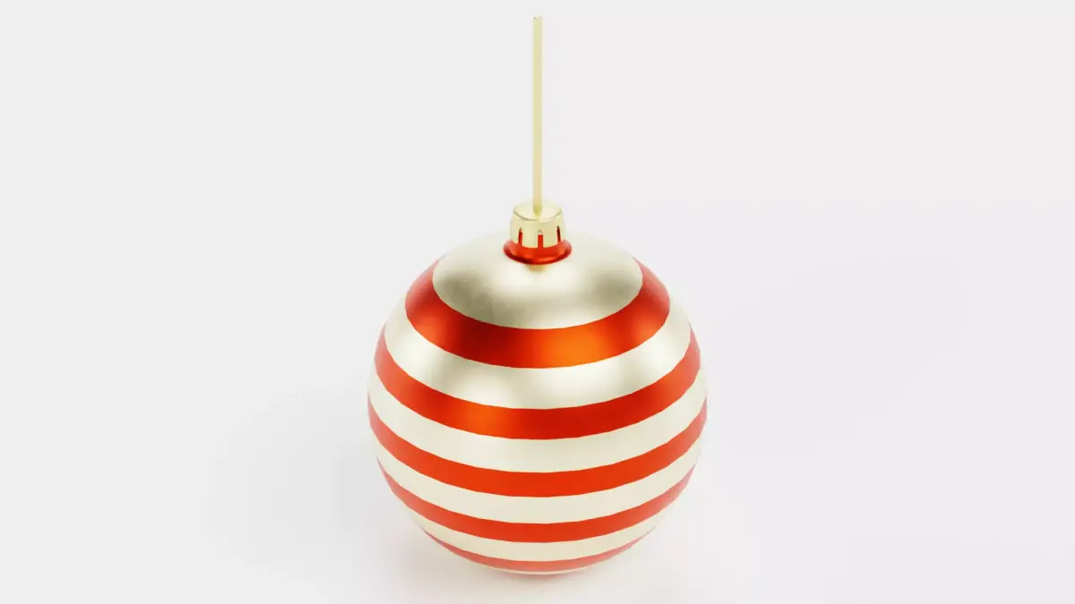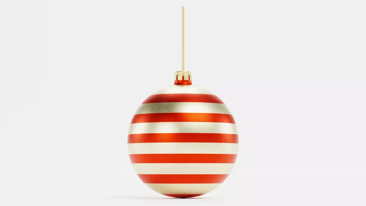 A high-quality 3D model of a classic Christmas ball ornament designed for realistic holiday visualizations and decorative scenes. The model features a smooth spherical surface with metallic cap detail and attached hanging string for a fully authentic appearance. This version presents a subtle silver base color with red decorative stripes.