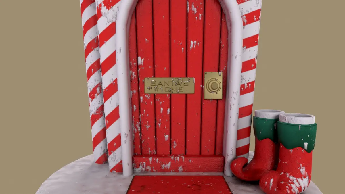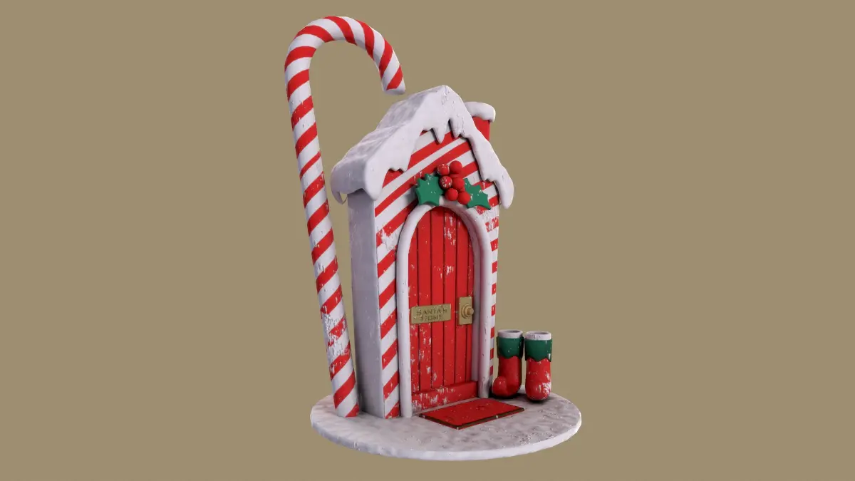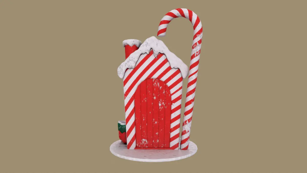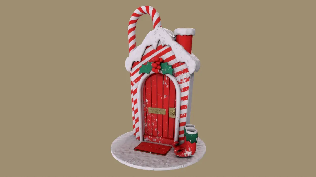 Welcome to the Candy Cane Cottage, a cozy elf home nestled in the heart of the North Pole! This festive little house is adorned with red and white candy cane stripes, a snowy roof, and a cheerful red door that invites warmth and holiday joy. A sprig of holly decorates the archway, and the elf boots by the doorstep hint at the playful inhabitants inside. Perfect for spreading holiday cheer, this charming cottage is an enchanting reminder of Santa's magical village!