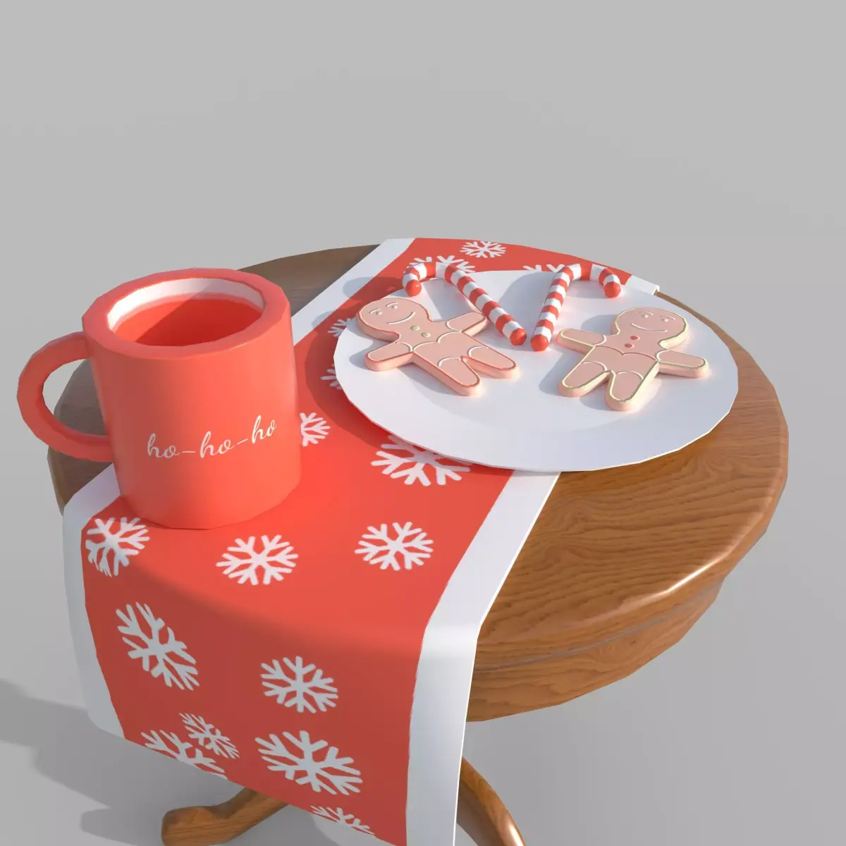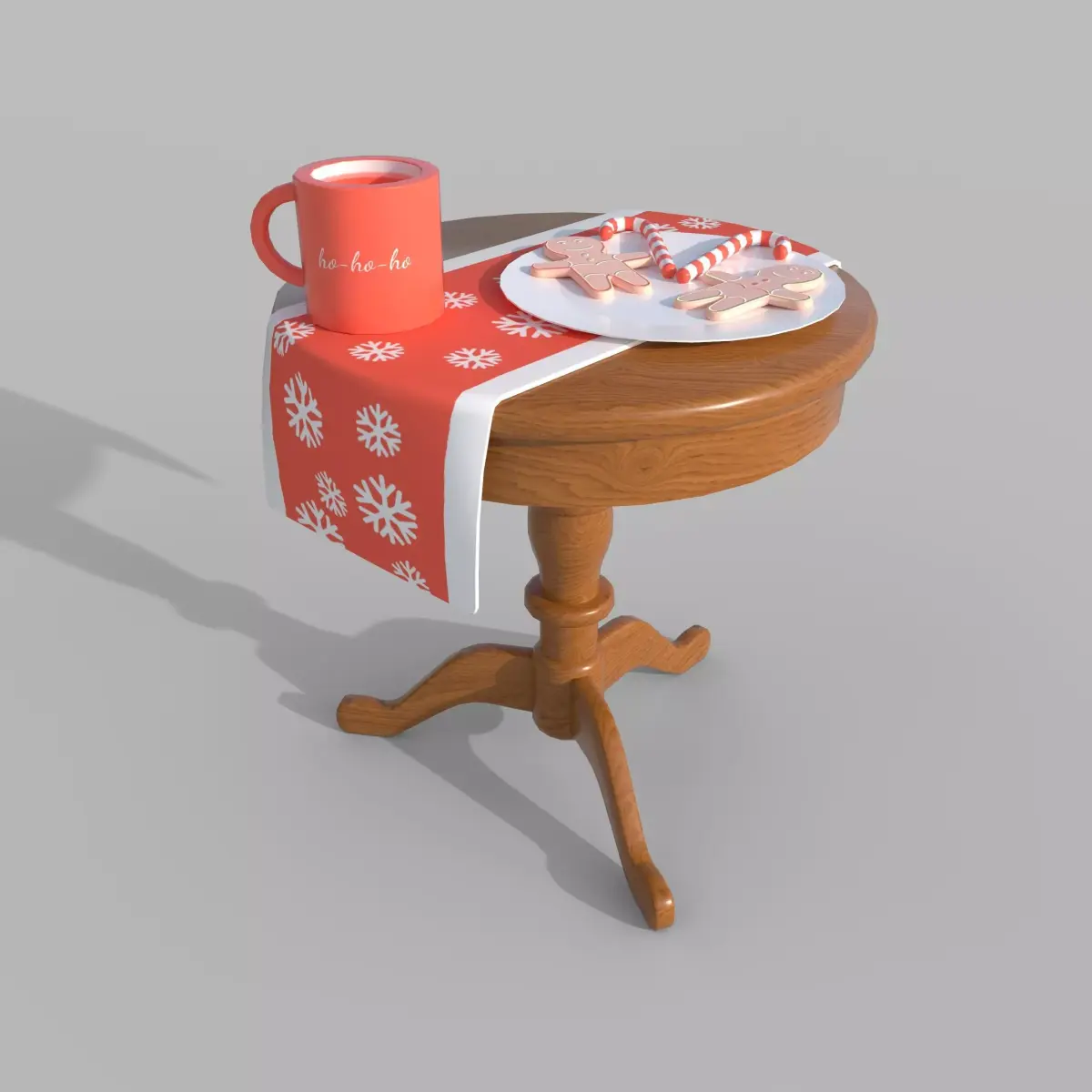 This asset features a wooden round chair/table styled with Christmas décor, including a festive table runner, a holiday mug, a plate of gingerbread cookies, and candy canes. The set captures a charming holiday mood with realistic materials, clean geometry, and carefully balanced proportions.
