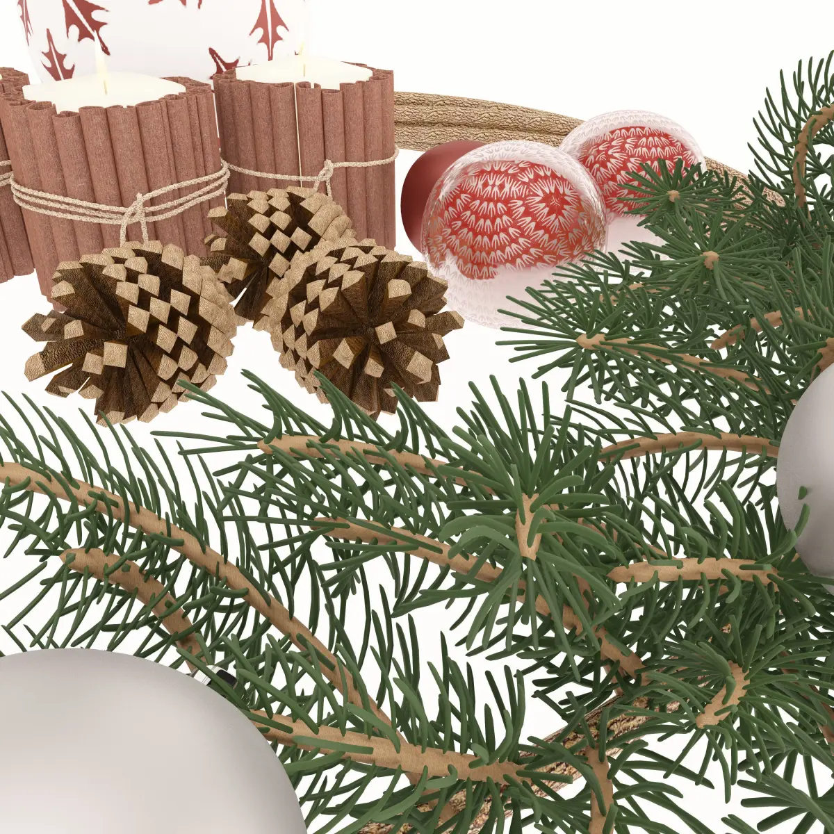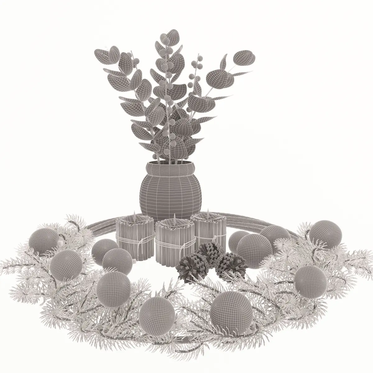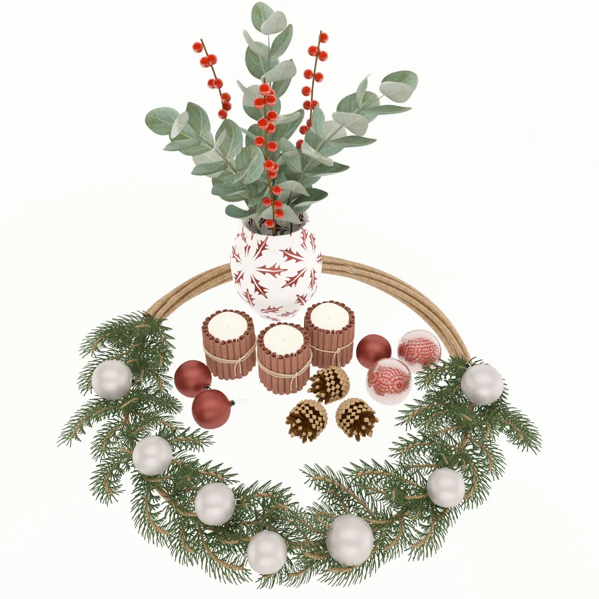 The Christmas set consists of a spruce wreath, a vase with eucalyptus and red berries, candles with cinnamon and New Year's toys