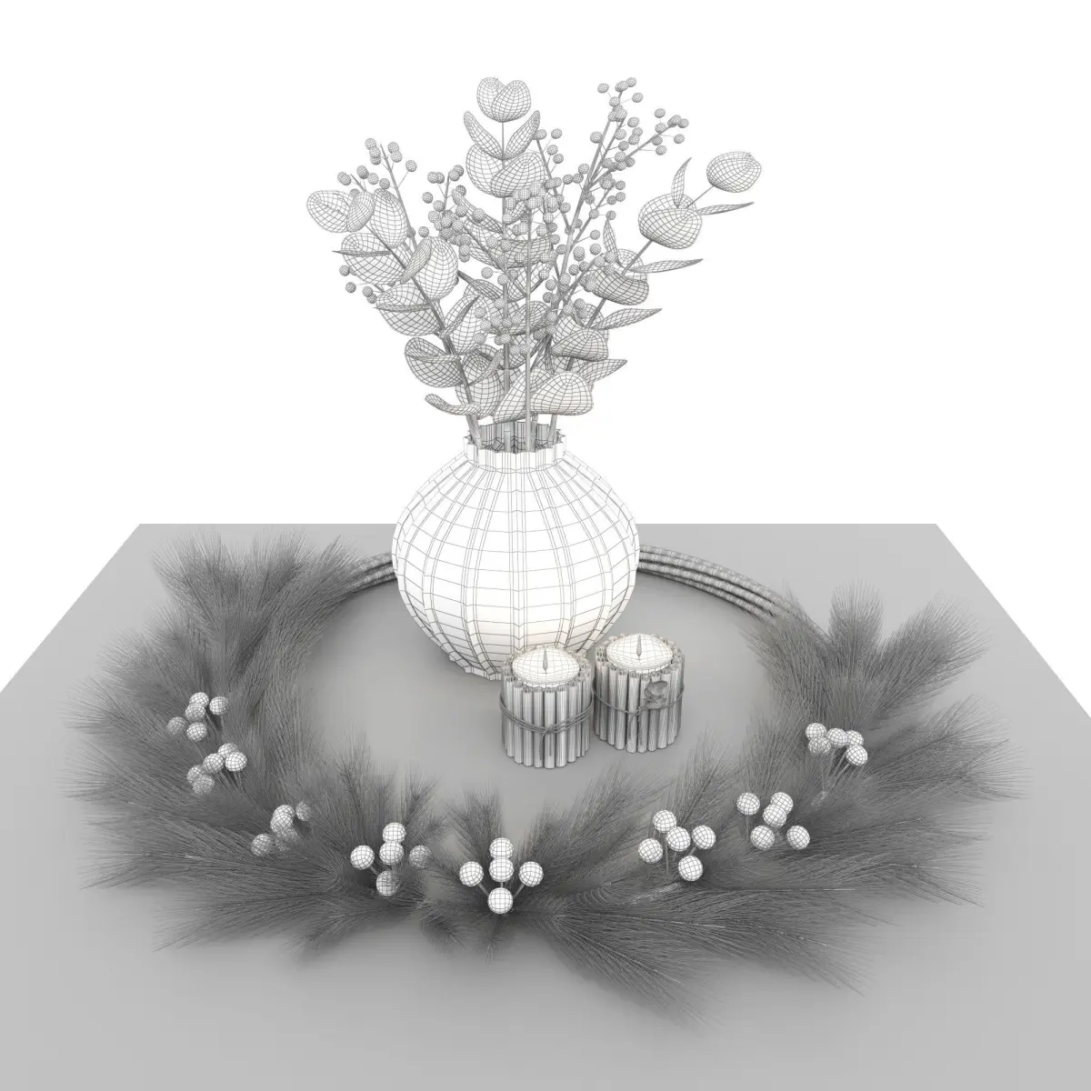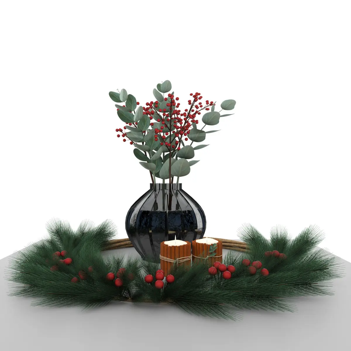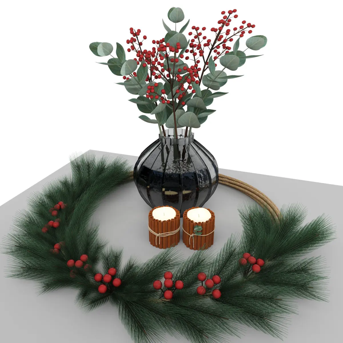 Christmas set consists of a pine wreath, a vase with eucalyptus and red berries and candles with cinnamon