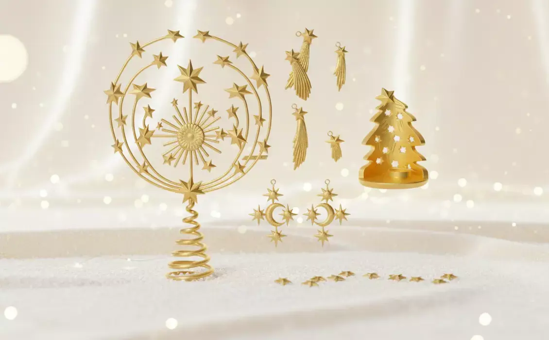 A truly celestial statement for the discerning decorator. This collection features intricately detailed ornaments that shine with the warmth. Centered around magnificent star and moon motifs, this luxury collection brings an atmosphere of high-end, festive charm and cosmic wonder to your Christmas tree.