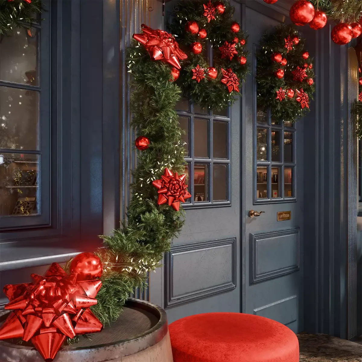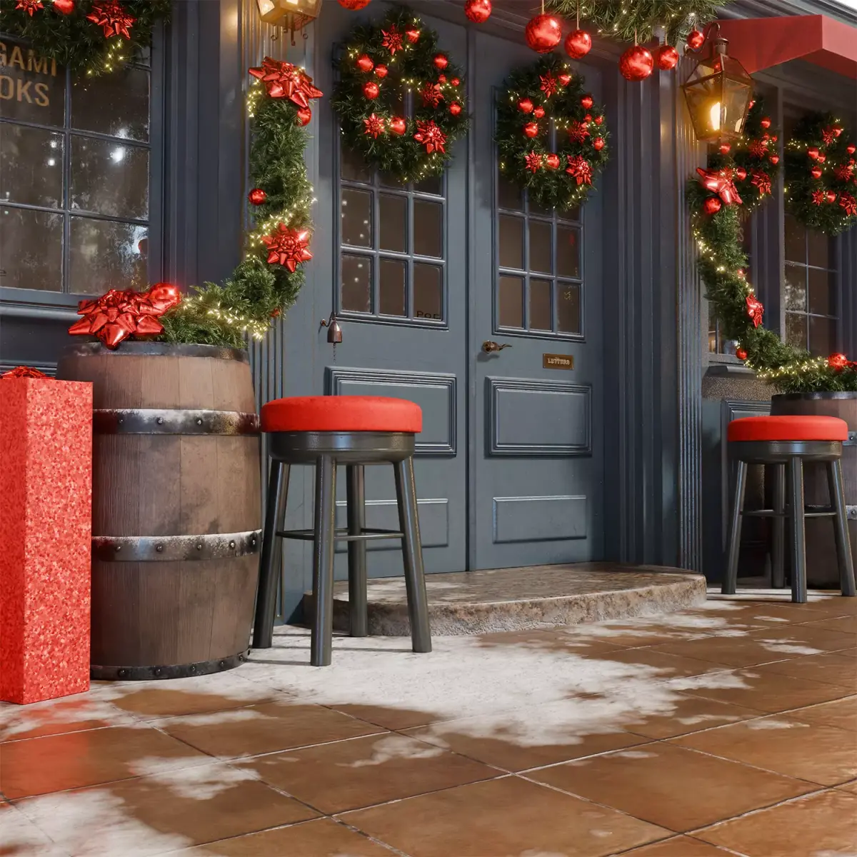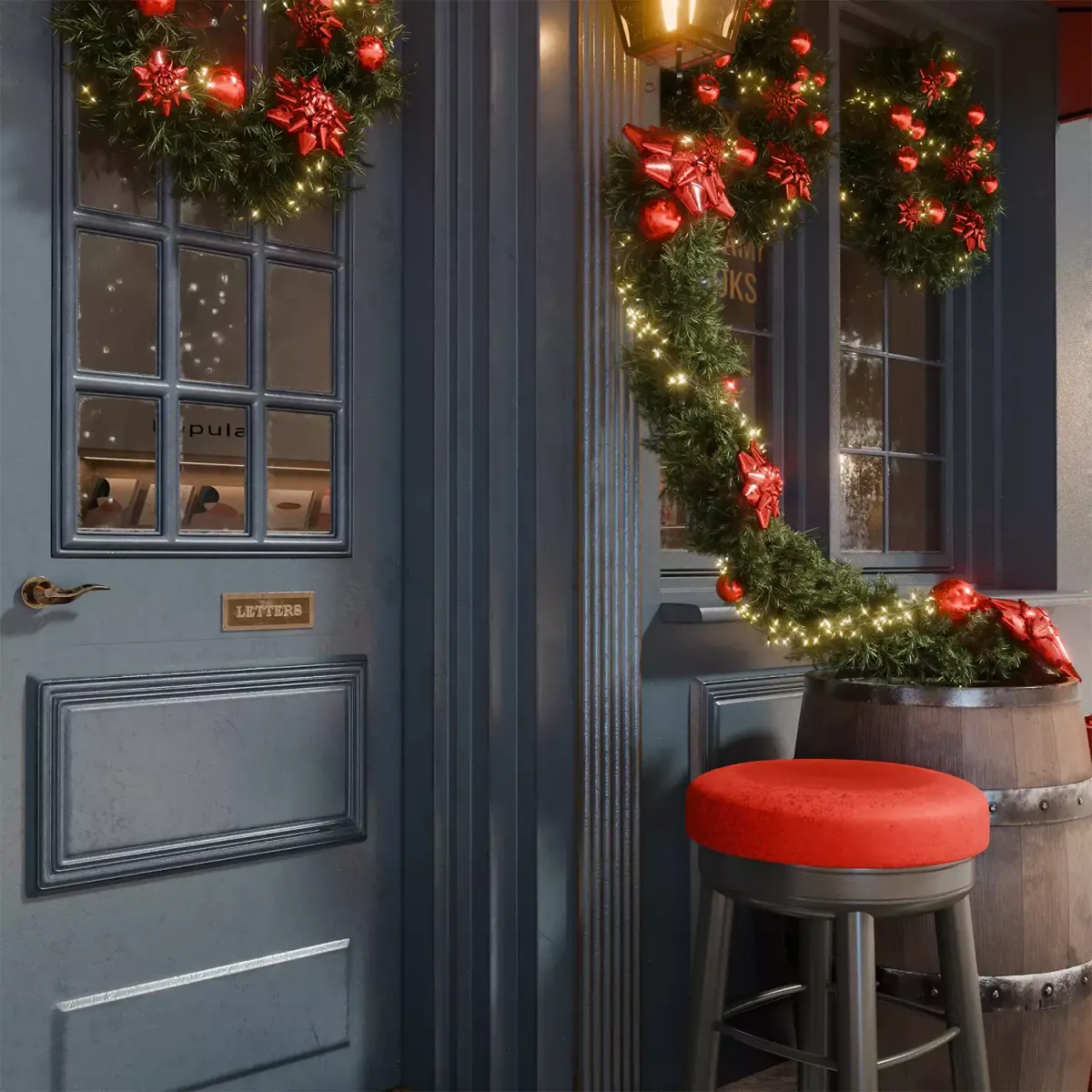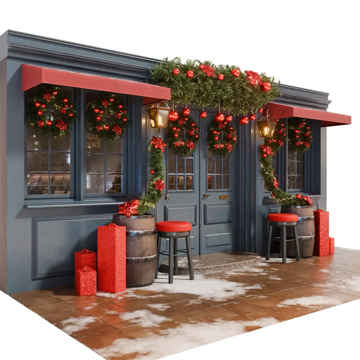 This highly detailed 3D model depicts the cozy façade of a small shop or pub, decorated in a classic Christmas style with predominantly red accents. The dark blue wall with red awnings above the windows creates a contrasting backdrop for the vibrant holiday decorations.