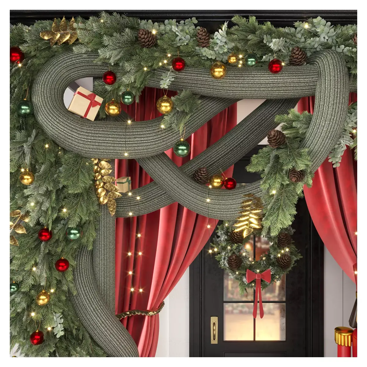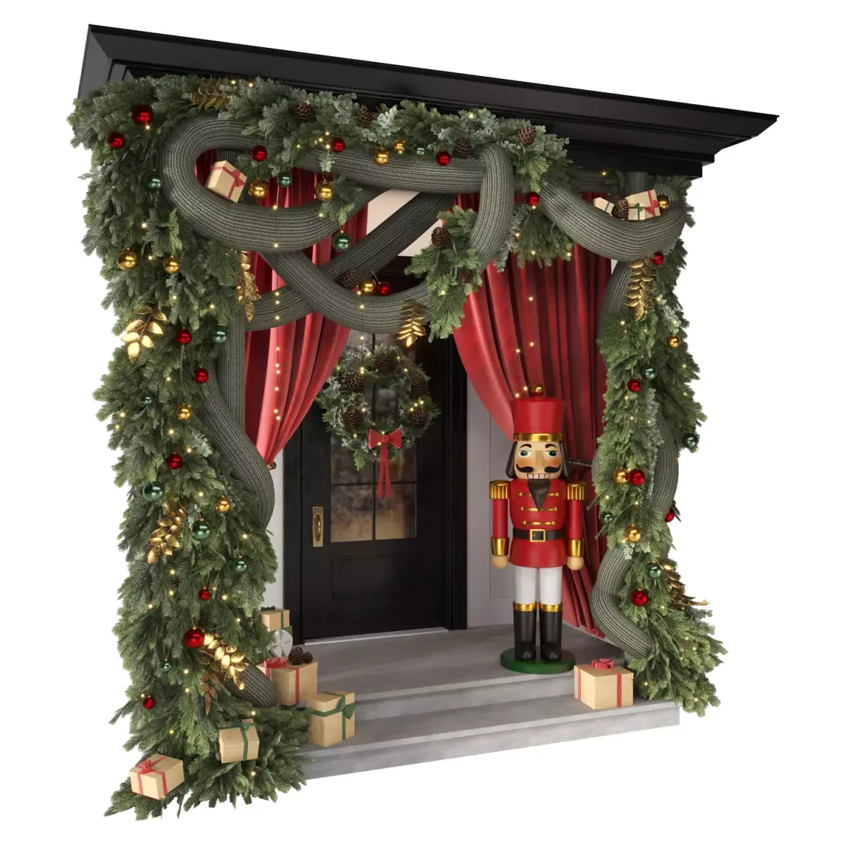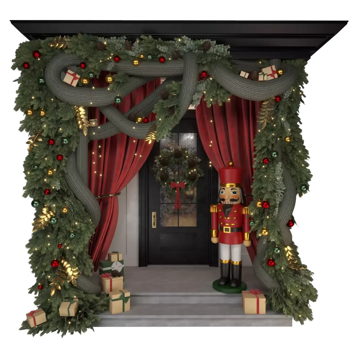 A festive residential entrance designed as a ceremonial gateway, where flowing curtains, layered greenery, and warm lighting transform the doorway into a welcoming Christmas portal.The model is optimized for professional architectural visualization and New Year exterior scenes.All materials and textures are original, created specifically for this model, and use high-resolution textures suitable for close-up renders.