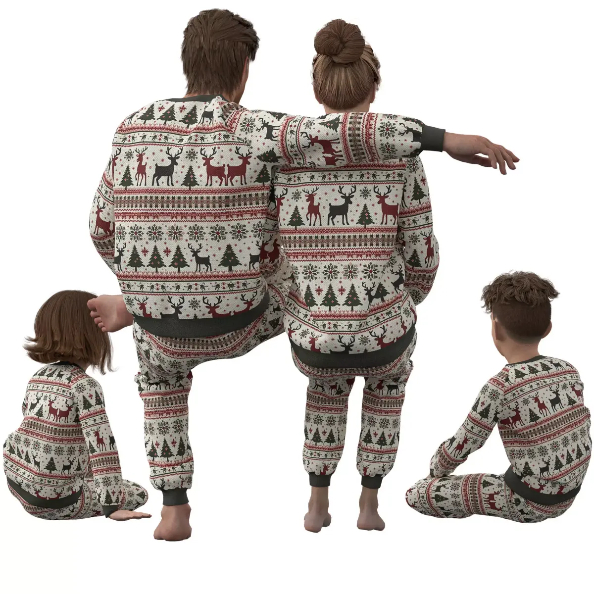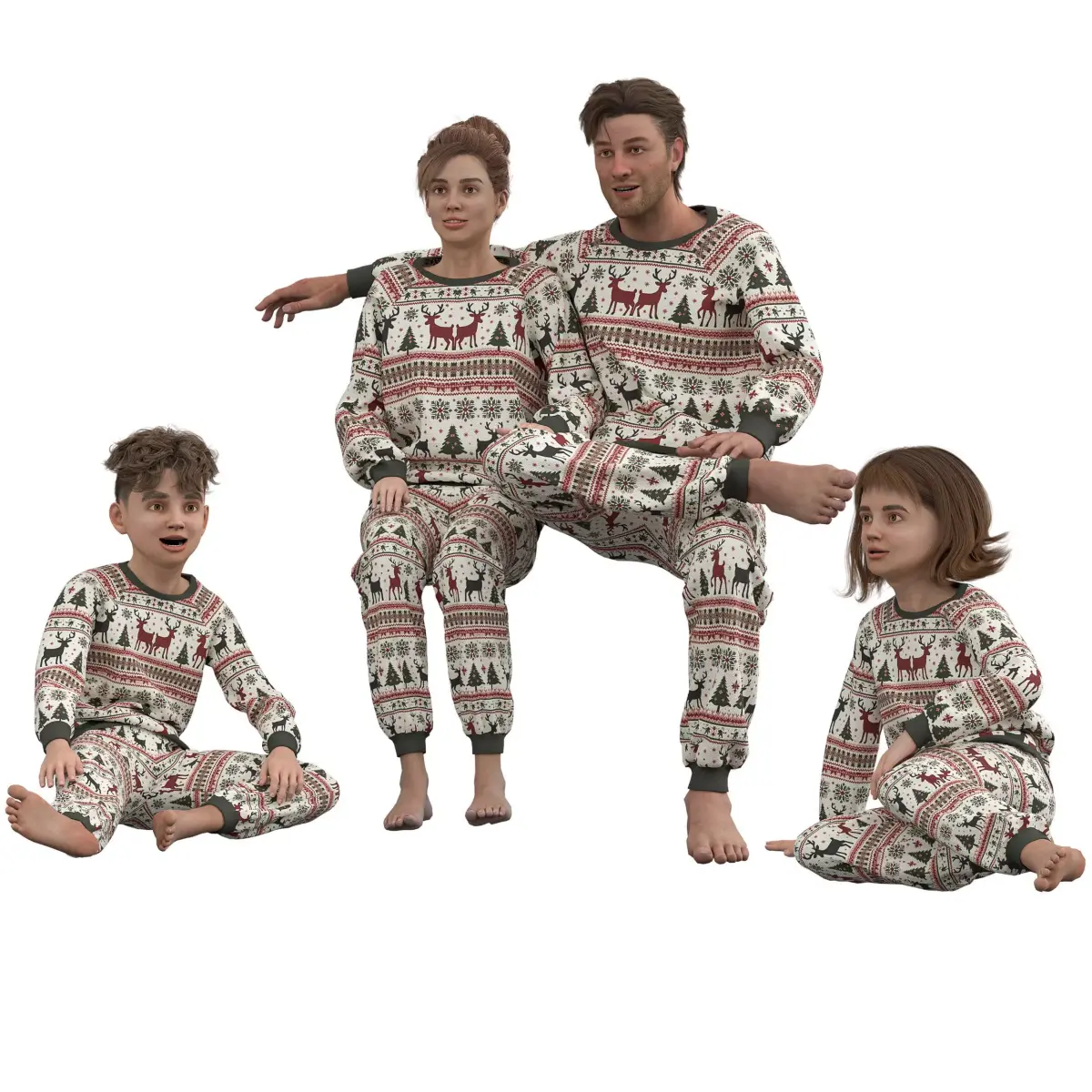 Festive Design: The characters are dressed in detailed Christmas-themed pajamas, complete with reindeer, snowflakes, and tree patterns, capturing the holiday spirit.Dynamic Poses: Each character is presented in a natural pose—sitting, standing, and kneeling—ready for animation or integration into your scenes.High-Quality Detailing: Meticulously crafted to ensure realistic textures and refined details, from the fabric of the pajamas to the facial expressions.Versatile Use: Ideal for holiday animations, game environments, virtual greeting cards, or family-themed 3D renderings.Optimized for Rendering: Compatible with Blender, Unreal Engine, Unity, and CLO Virtual Fashion for seamless integration into your workflow.
