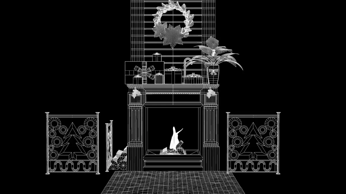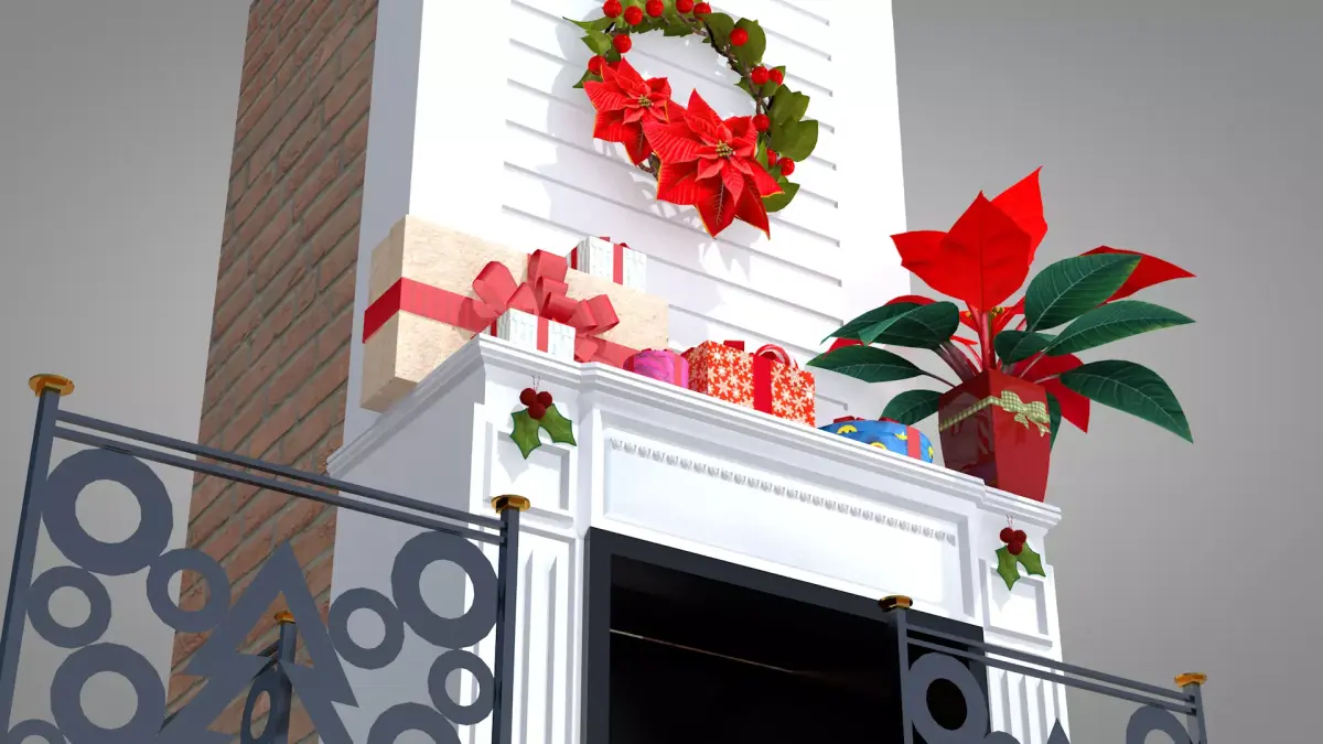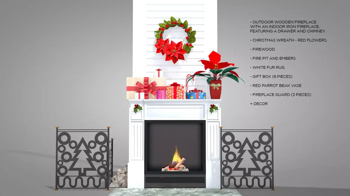 The Christmas fireplace decor has a 2k UV mapping texture.It's a project that includes: an external wooden fireplace and an internal iron fireplace with a drawer and chimney, a red parrot beak vase, fireplace guards (3 pieces), a white fur rug, a wreath, gift boxes (6 pieces), and more decorations.