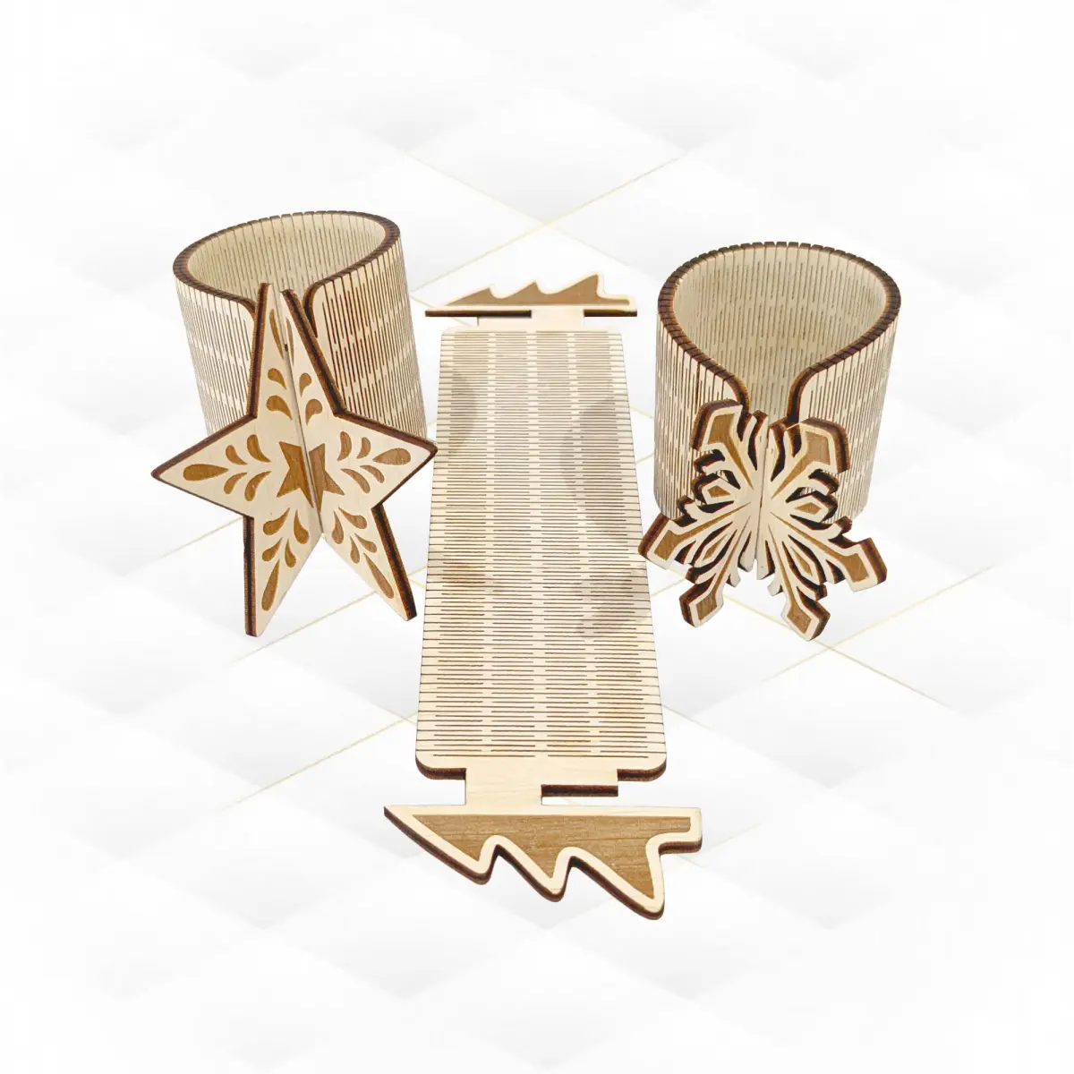 Files for cutting Christmas decor from 3mm material thickness are included. The photographs show a design Christmas Napkin Holder (3 designs) with dimensions:217 x 61 mm (8.5 x 2.4 inch), 208 x 47 mm (8.2 x 1.9 inch), 193 x 51 mm (7.6 x 2 inches).Flexible part 132 x 42 mm.Largest part size 217 x 61 mm (8.5 x 2.4 inch). Without glue!