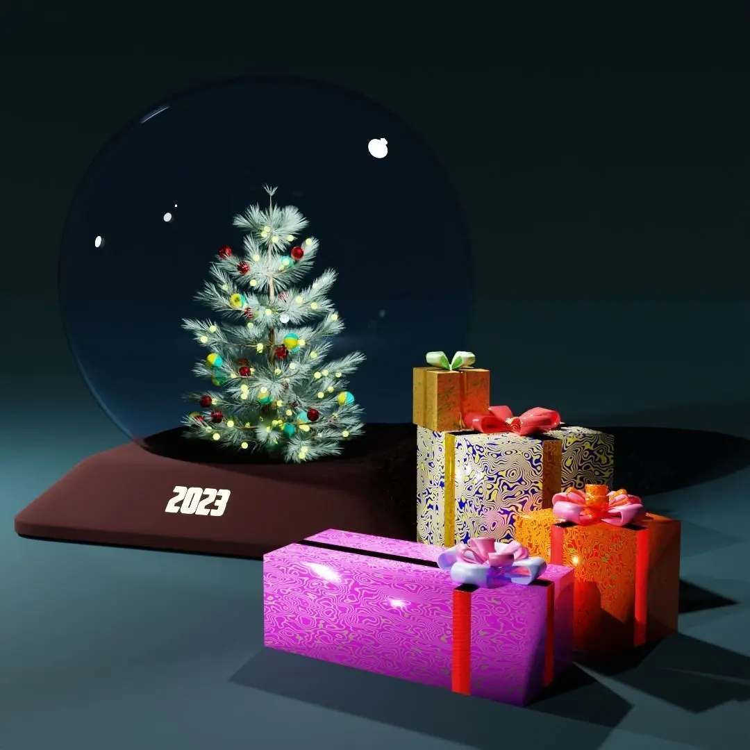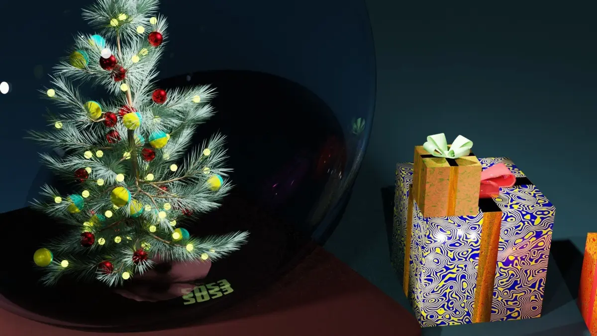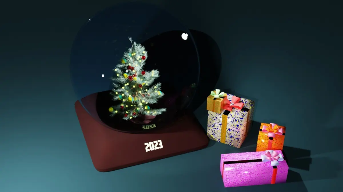 Christmas Glass Ball with Cristmas Tree scene and gift boxes.