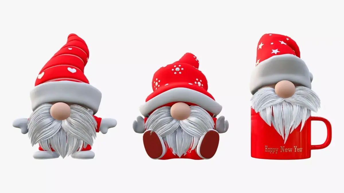 Three decorative Christmas gnomes with long beards and patterned hats. One is standing, another is sitting, and the third is placed inside a cup with the inscription “Happy New Year.” An atmospheric festive set for visualizations and holiday decor.