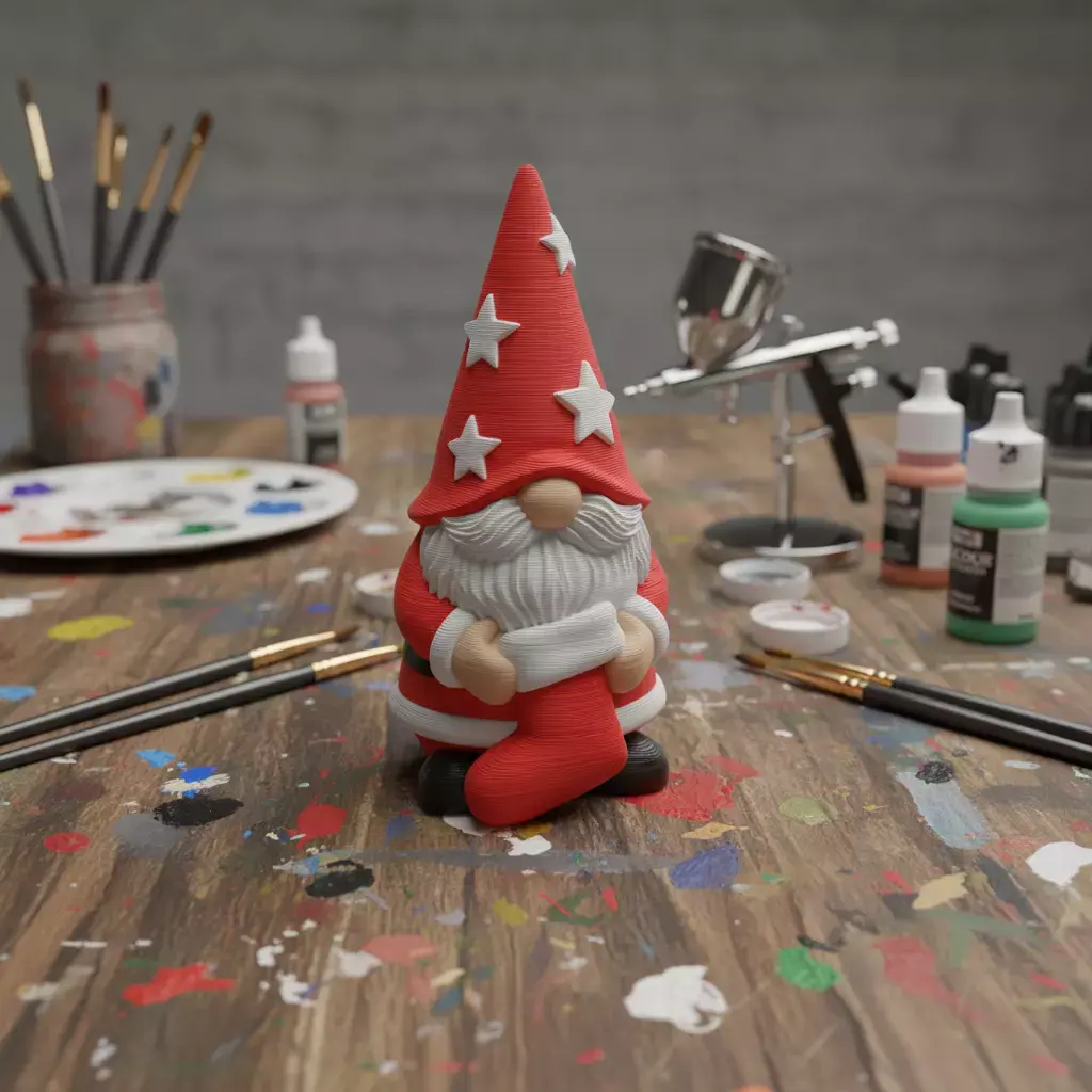 This model features the classic garden gnome style with a bushy white beard and a round nose, updated with a festive twist. It is perfect for decorating your fireplace mantel, adding to a winter centerpiece, or printing as a cheerful gift for friends and family.