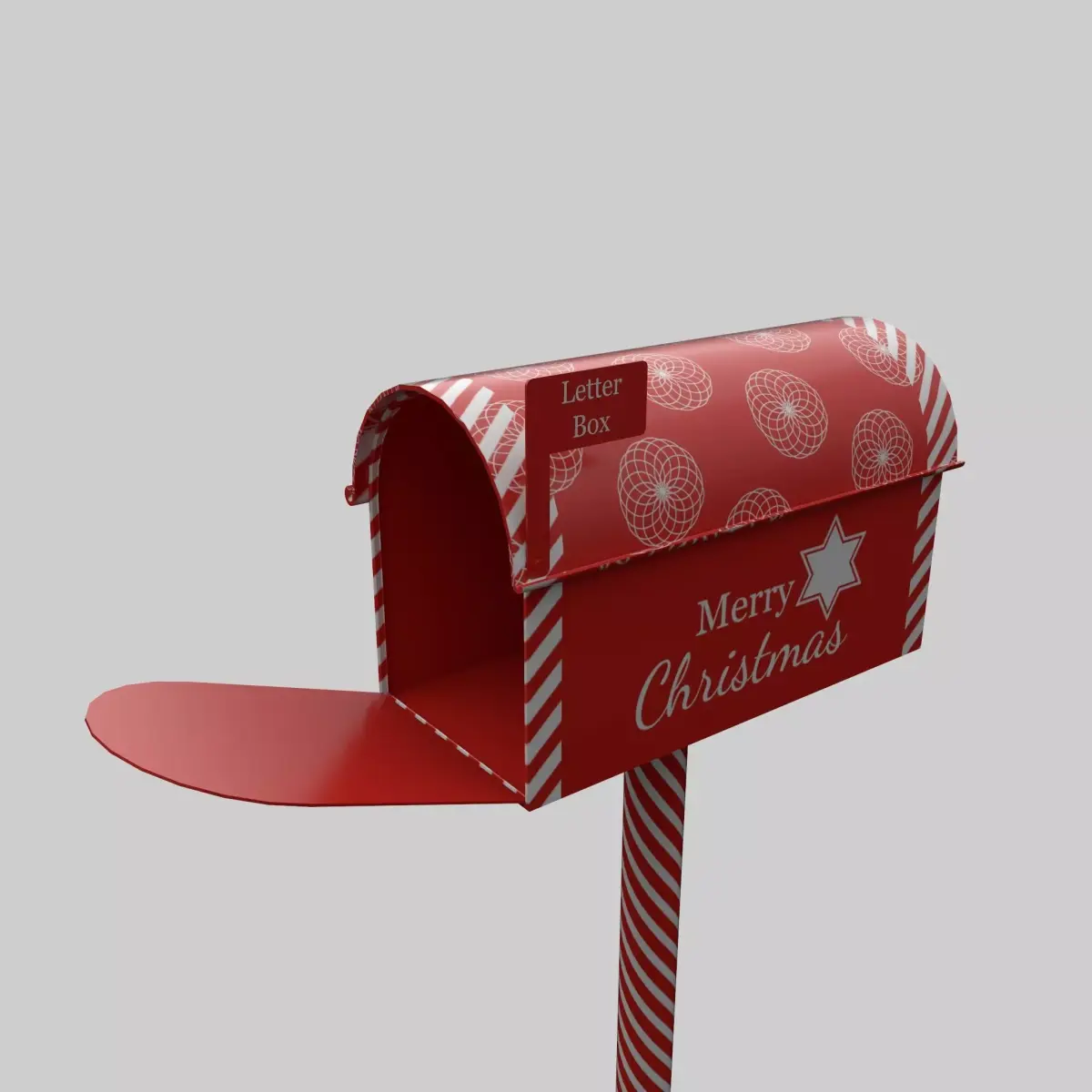 This model features a classic mailbox form mounted on a post, decorated in Christmas red, candy-cane striping, and holiday graphics such as “Merry Christmas” text and festive patterns.Ideal for winter scenes, Santa-themed environments, and holiday storytelling.