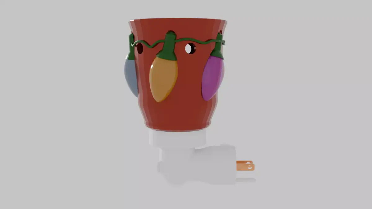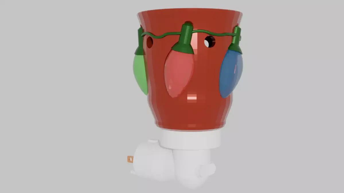 This Christmas Lights Mini Plugin Wax Warmer brings festive cheer and warm holiday glow to any outlet. It features a contoured red shade wrapped in a strand of colorful Christmas lights, each bulb connected by a delicate wire for a playful, realistic touch. The bulbs are semi-transparent, allowing soft illumination to shine through when the warmer is in use. Small cutout holes around the shade let additional light escape, creating a charming pattern on nearby walls that enhances the cozy seasonal atmosphere. Designed to melt wax cubes from the top dish, this compact warmer is perfect for kitchens, hallways, or bathrooms where you want a pop of Christmas spirit paired with inviting fragrance.