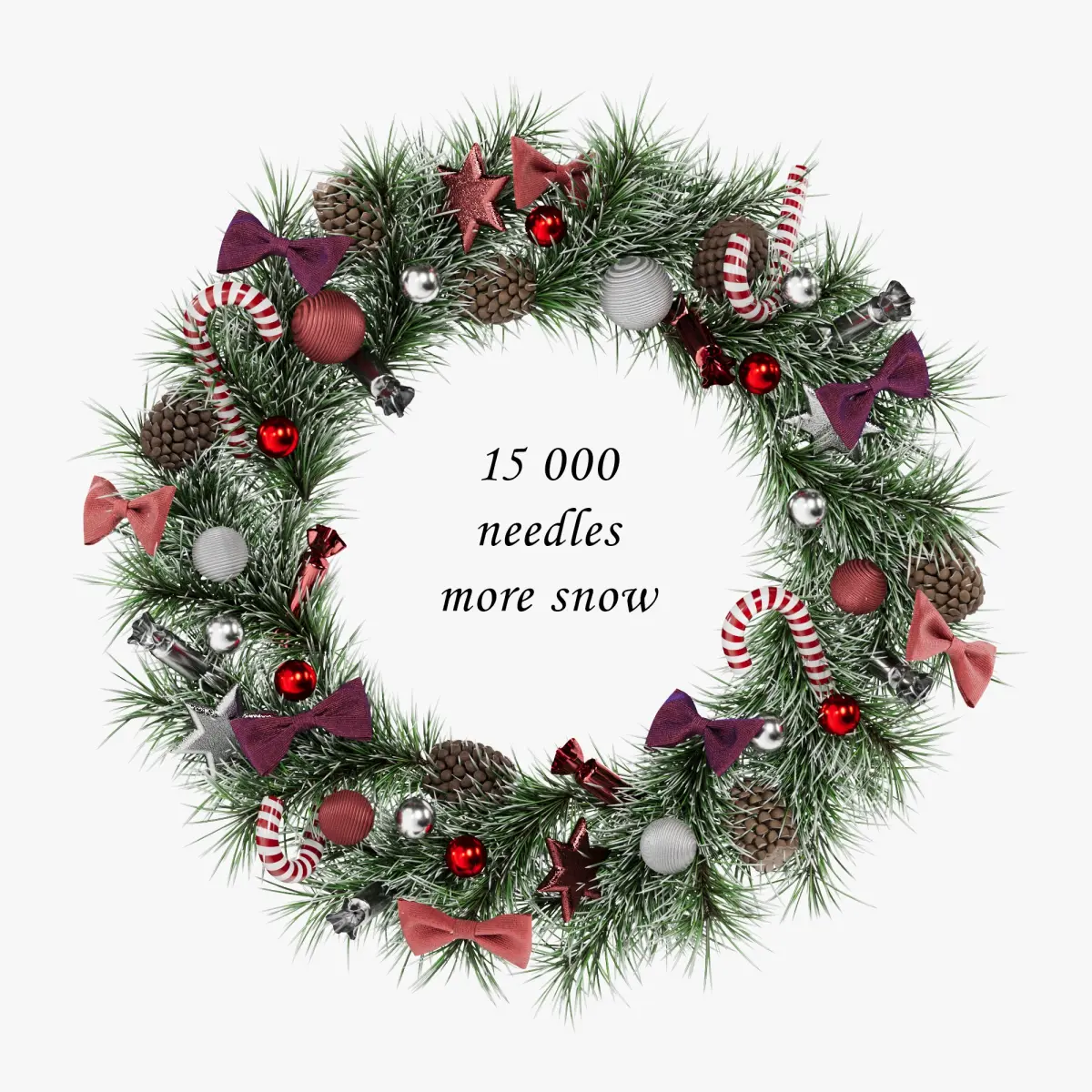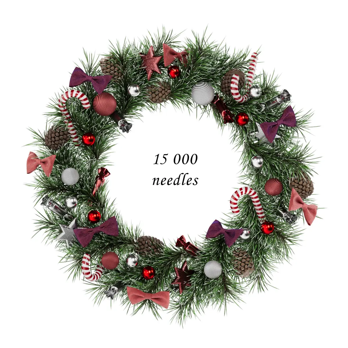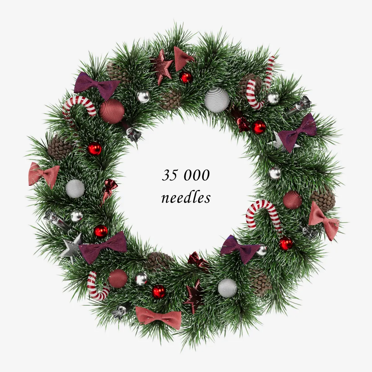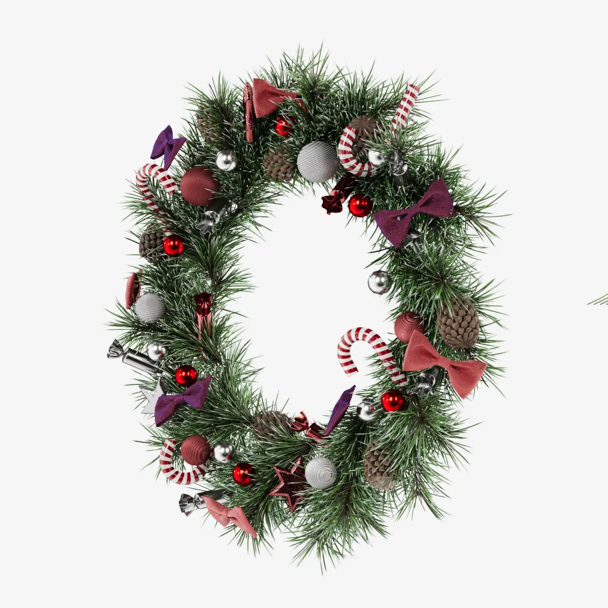 A highly detailed and festive Christmas wreath featuring realistic pine branches, bows, candy canes, pinecones, and sparkling ornaments in a classic red, silver, and white color scheme. Perfect for holiday-themed 3D scenes or decorations. Rendered with Corona Renderer version 6. The archive includes an OBJ file for easy use in various 3D applications.