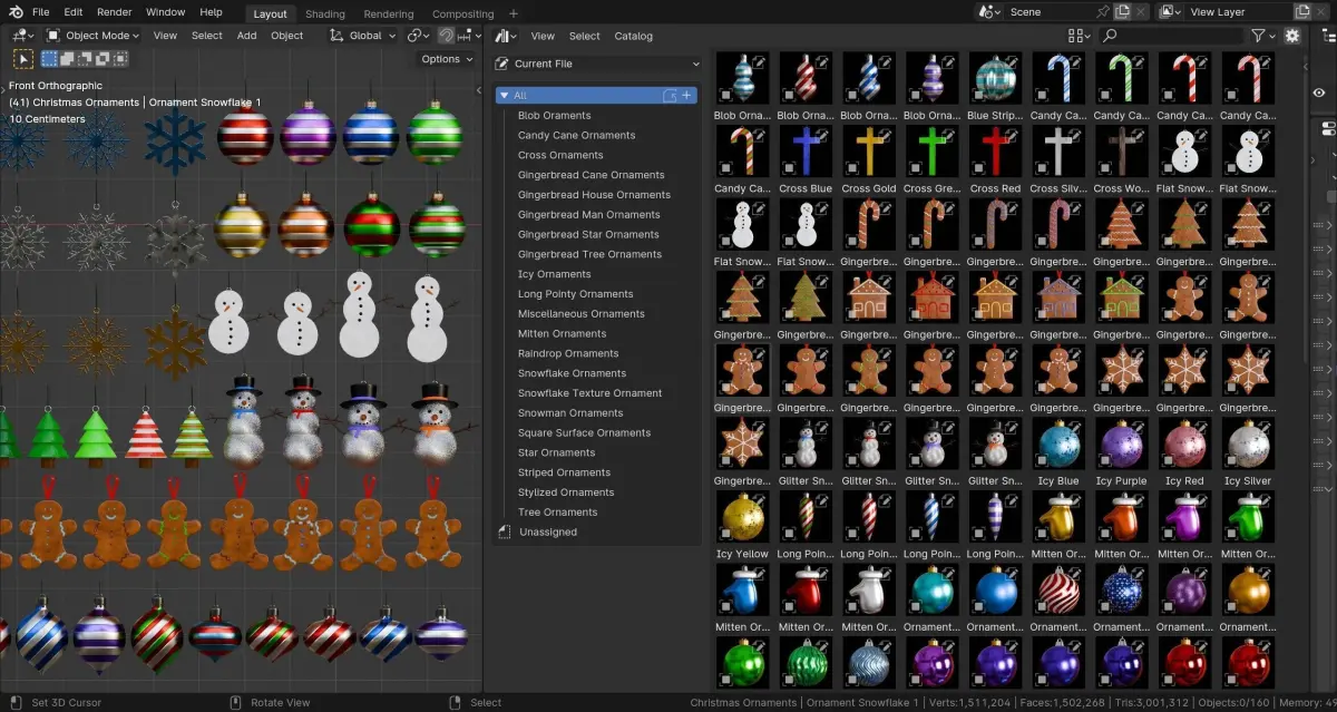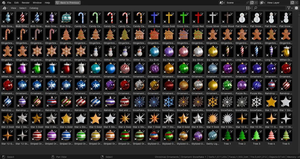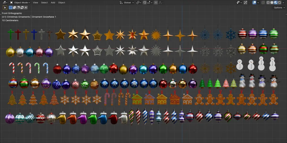 In this Christmas Ornaments Asset Pack you will get 160 Christmas Ornament 3d Models, created with Blender and Pre-Setup for the Asset Browser. Use these assets to quickly fill your holiday scenes with ornament decorations.
