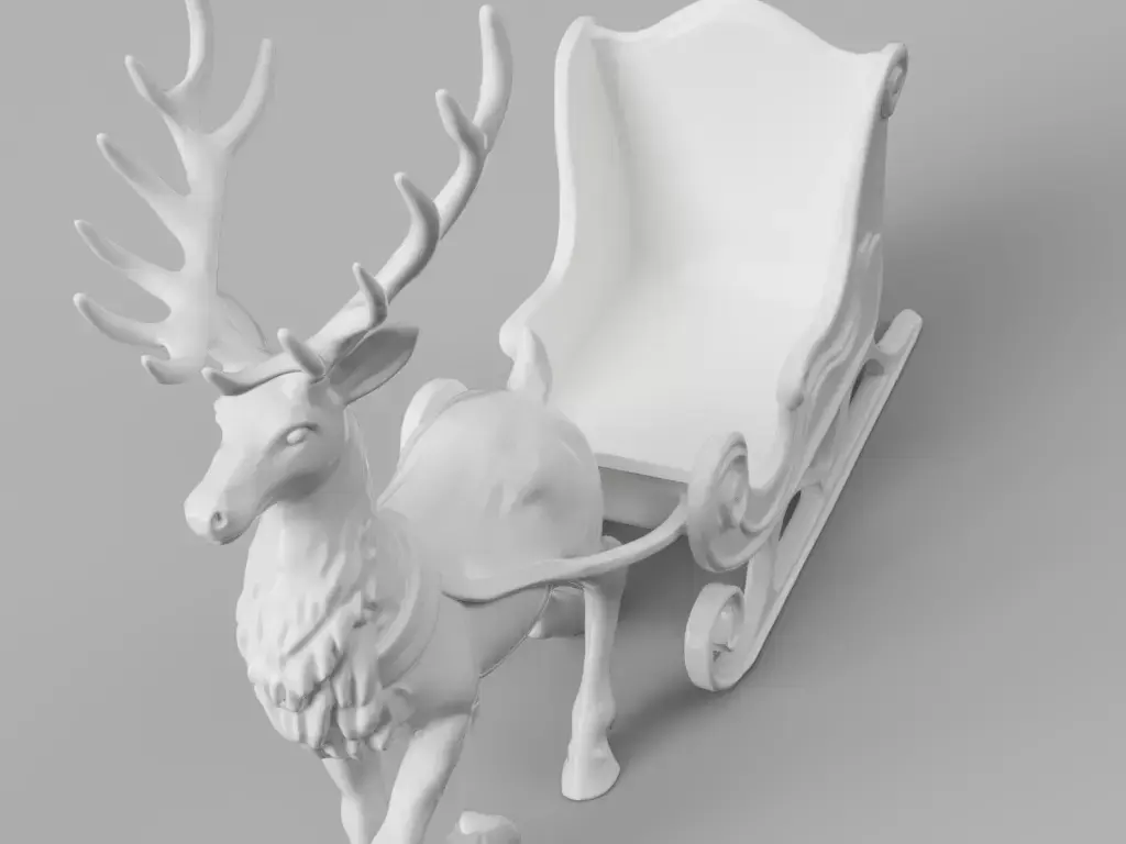 A detailed, white 3D model featuring a festive reindeer harnessed to an ornate, classic sleigh. This high-quality render or printable file is an excellent decorative element for Christmas, holiday visualizations, or seasonal projects.
