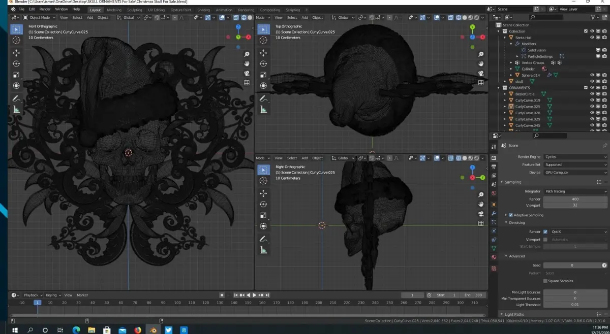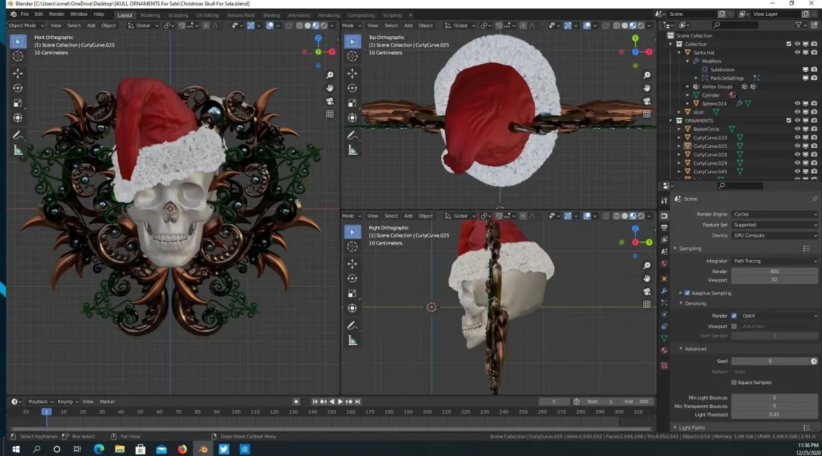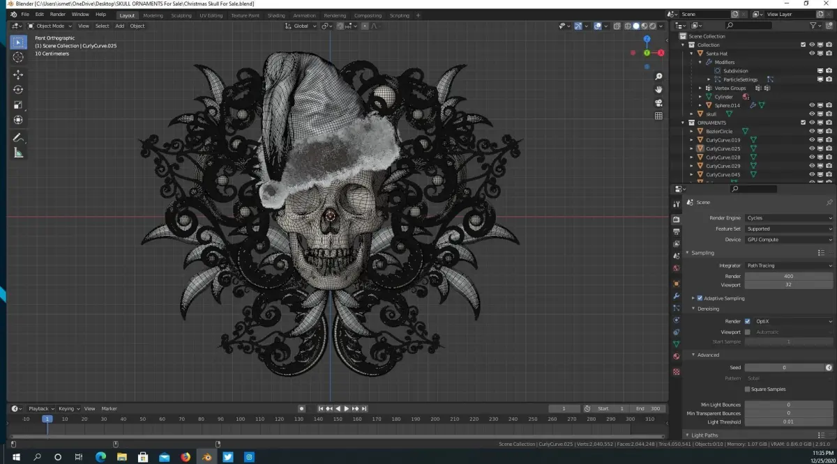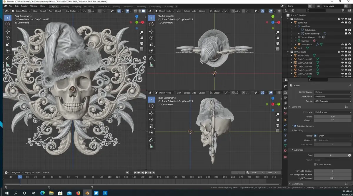 I am including two versions of this 3D model. One with the Christmas Santa hat and one without. Both versions are available in multiple file formats as well as the original .blend file that was saved in Blender 2.91. The ornaments were created using curves with bevel and extrusion, then converted to mesh objects.