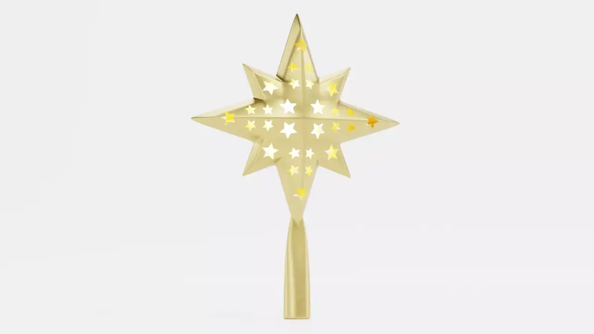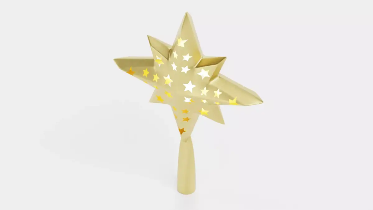 A realistic 3D model of a Christmas star tree topper, designed with clean geometry, metallic surface detailing, and precise form for an authentic festive appearance. The eight-pointed star features a gold finish with subtle reflections and a base mount for easy placement on a tree top.