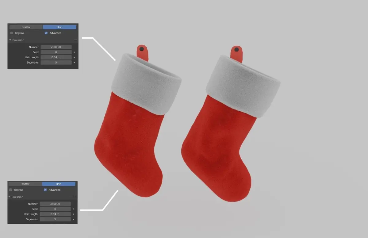 2 Christmas stockings made in Blender 2.8Used a particle system with 350.000 hairs for the stocking and 250.000 on the rim.Particle System not applied, settings and hair amount can be changed easily.Included a version with an applied subsurface modifier and one with a lower amount of faces.