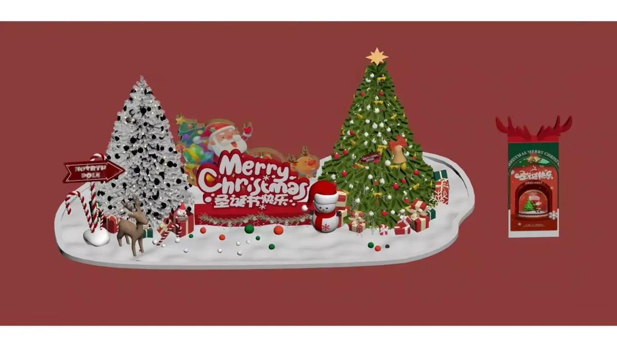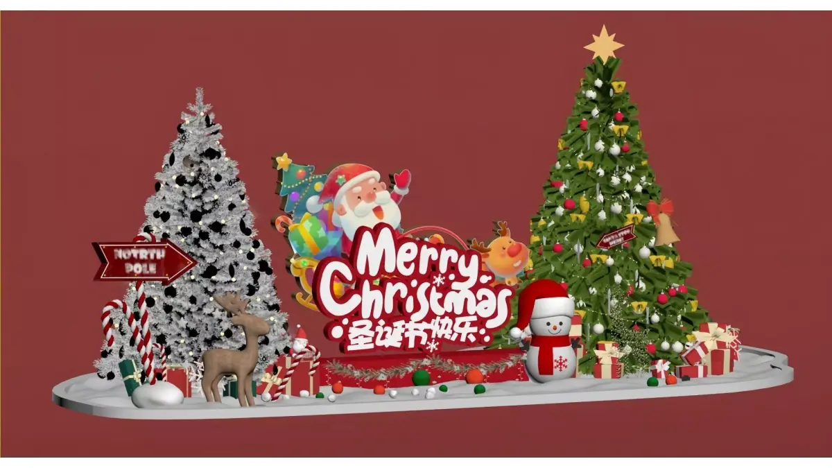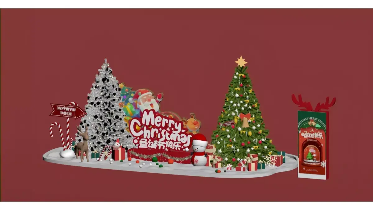 This is a festive Christmas-themed scene with red as the main background color, complemented by white snow elements, presenting a strong Christmas atmosphere. The picture includes classic Christmas elements such as exquisitely decorated Christmas trees (two styles: silver-white and dark green), Santa Claus images, cute snowmen, reindeer, candy canes, and gift boxes. It is also accompanied by bilingual blessing texts: Merry Christmas and 圣诞节快乐 (Shèngdànjié Kuàilè). The overall style is lively and warm, making it a typical Christmas decorative design.