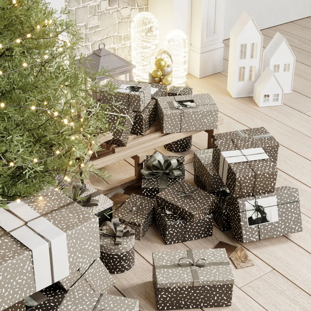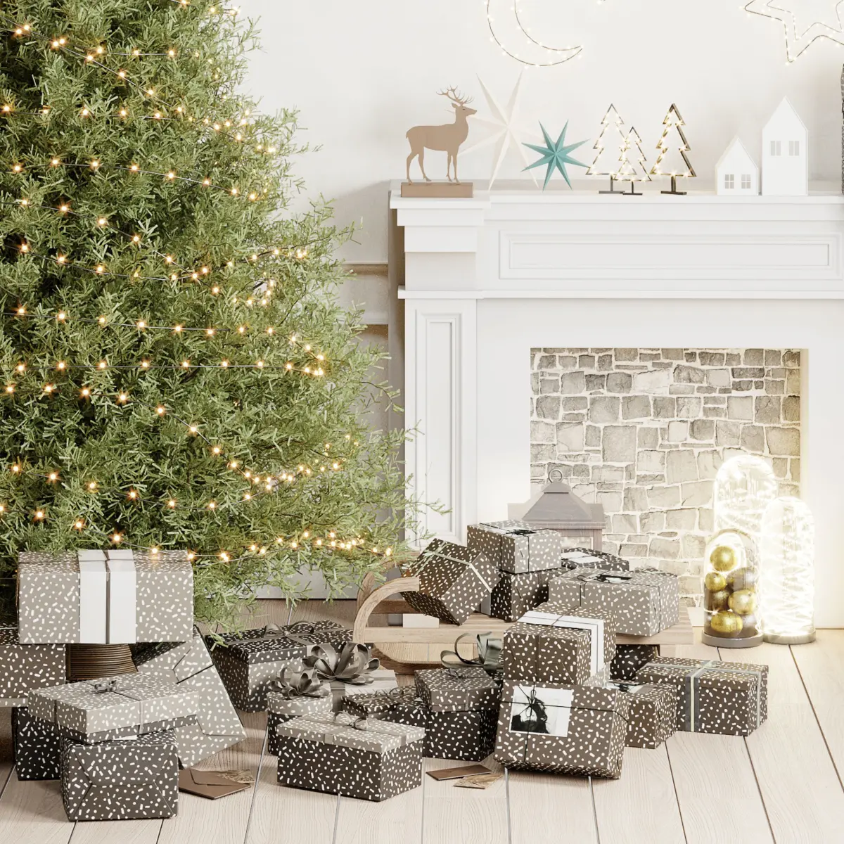 present, gift, celebration, new, year, birthday, christmas, bow, tape, wrapper, packaging, box, surprise, gold, gloss, beige, wreath, a, toy, garland, lamp, fireplace, decorative, tree, decoratio