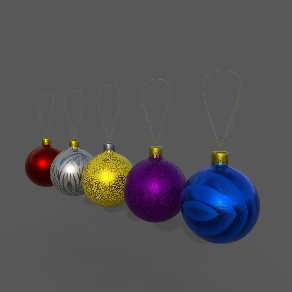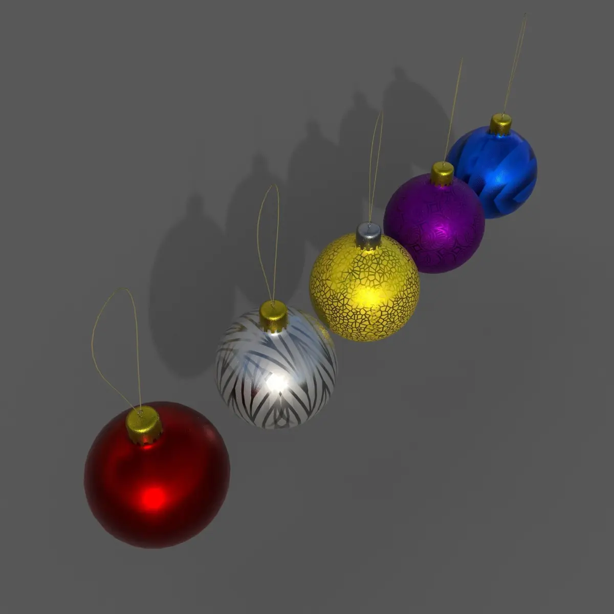 There are 5 objects in the scene: Christmas ball toy 1, Christmas ball toy 2, Christmas ball toy 3, Christmas ball toy 4 and Christmas ball toy 5.