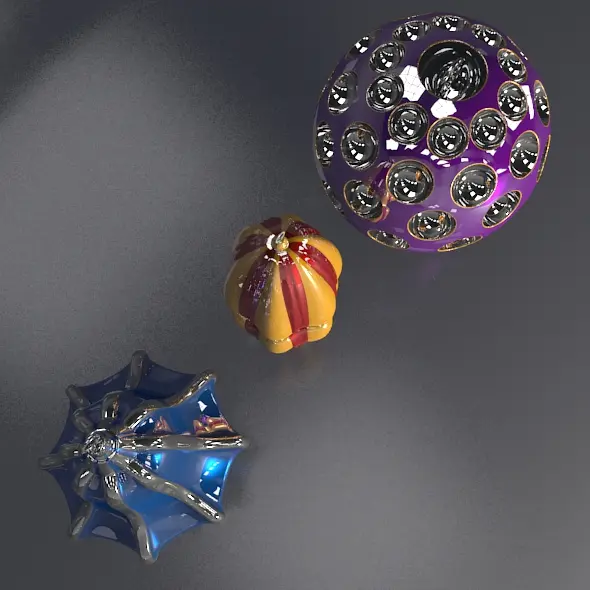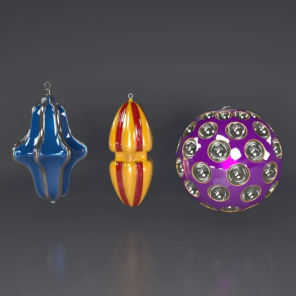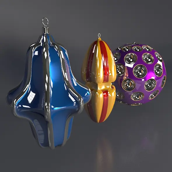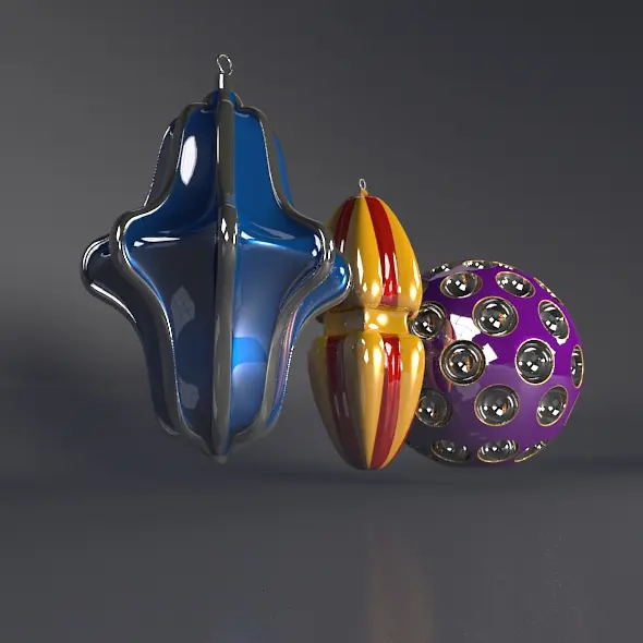 Cad Printable 3d models of christmas tree decoration items.I didn't use any image references,I just played with forms and shapes and see what will come out of it.Models created with moi3d nurbs modeling software similar to rhinoceros 3d.Rendering preview images with blender3d 2.69,settings included in blend file.Objects JOINTED,named by materials.I payed attention on how colors of my items will blend with green color of christmas tree.All the files except stl are NGONS.The STL file has a lot of polys cause 3d printing precision.I hope you will like it. Wish you Happy holidays.