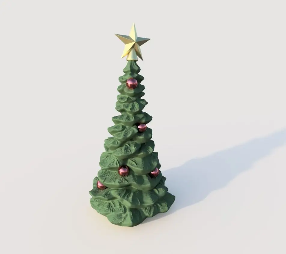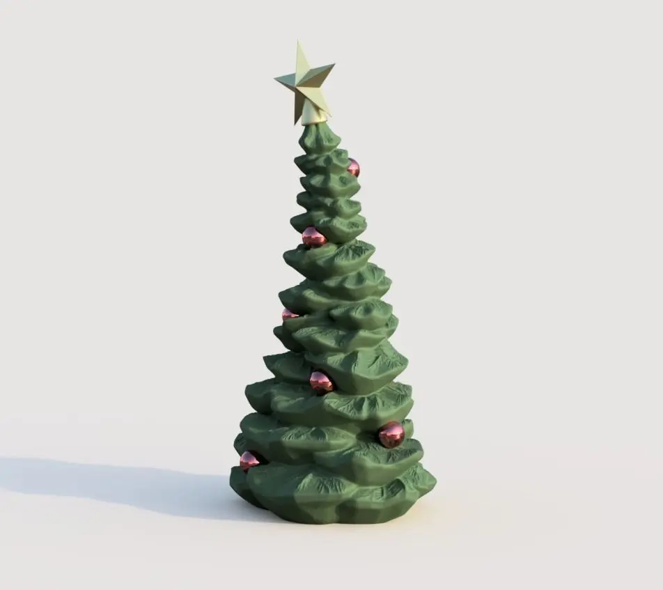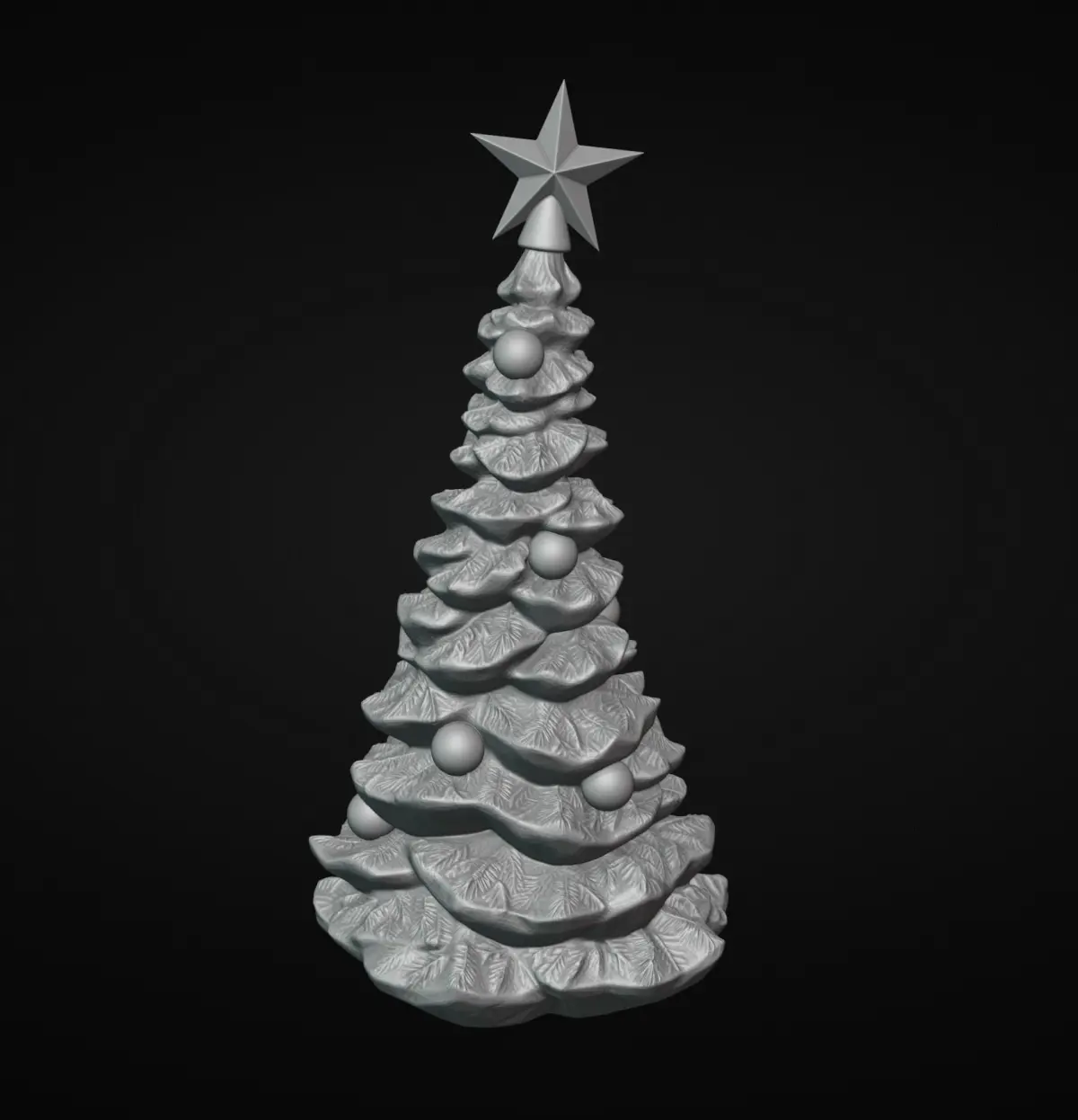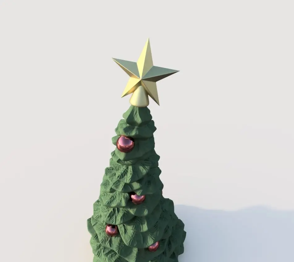 This is a 3D sculpted christmas tree with a star on top and some spheres decorating it.