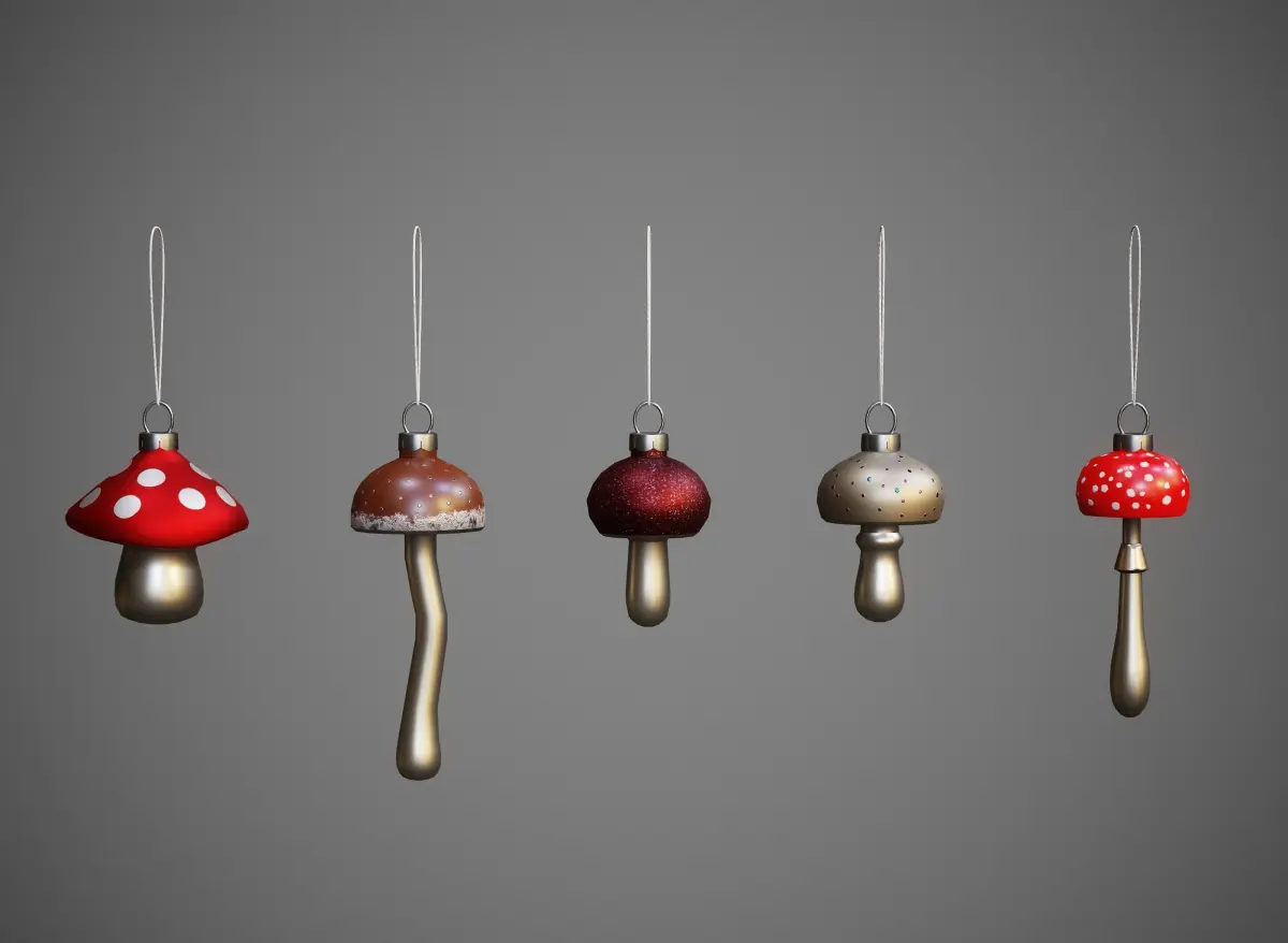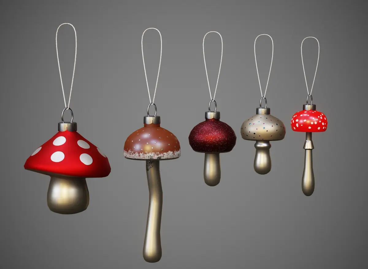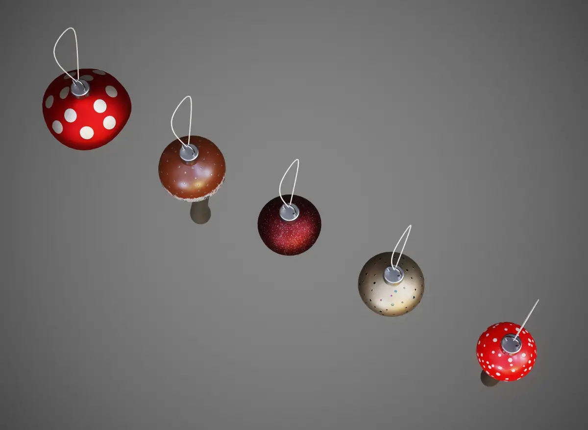 The scene has five objects (five Christmas tree toys - mushrooms). All of them have one common material and one UV map.